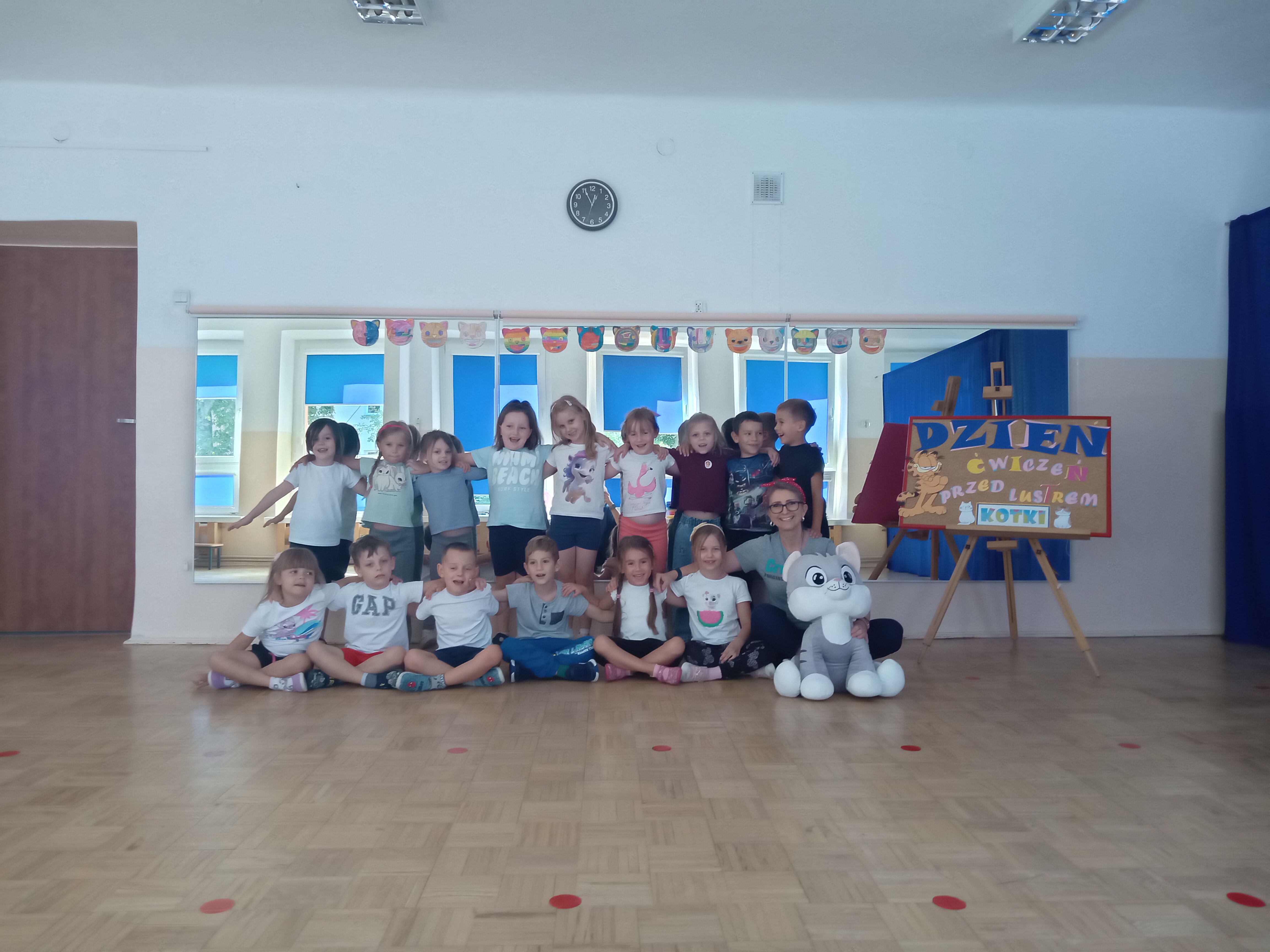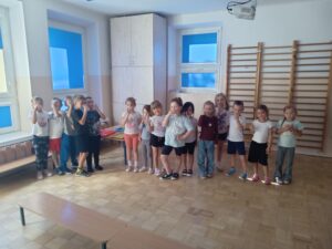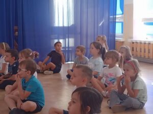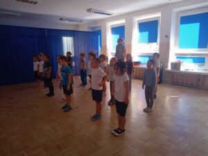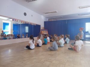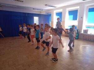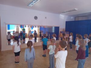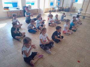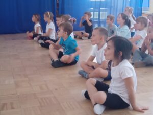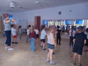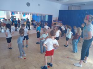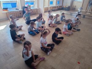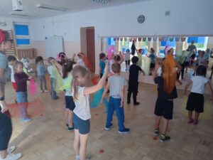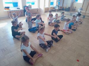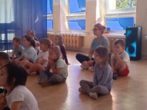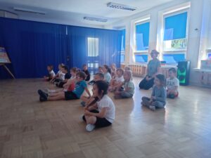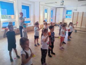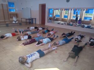 Nasze „świętowanie” rozpoczęliśmy tradycyjnie od rozgrzewki. Gwizdek i hop – skok, bieg, marsz w wysokim unoszeniem kolan. Po wstępnej aktywności wskazywaliśmy części ciała, śmiechem budziliśmy ze snu przeponę (śmiała się „babcia”, śmiał się „dziadek”, małe dziecko, kobieta i mężczyzna). Nie zabrakło również ćwiczeń o charakterze wyciszającym. Znaleźliśmy się wewnątrz szklanej kuli, którą musieliśmy pomalować w paski, kropki, zygzaczki i inne wzorki.