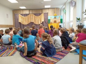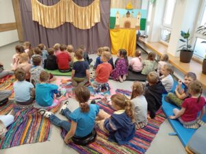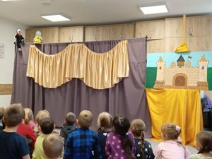 Dnia 26.09.2025r. dzieci z grupy „Kotki” i „Myszki” miały niezwykłą okazję uczestniczyć w wyjątkowym wydarzeniu. Na zaproszenie KLUBU Senior+, najmłodsi udali się na spektakl pt. „Kopciuszek”, który w całości został przygotowany i zaprezentowany przez uzdolnionych seniorów.