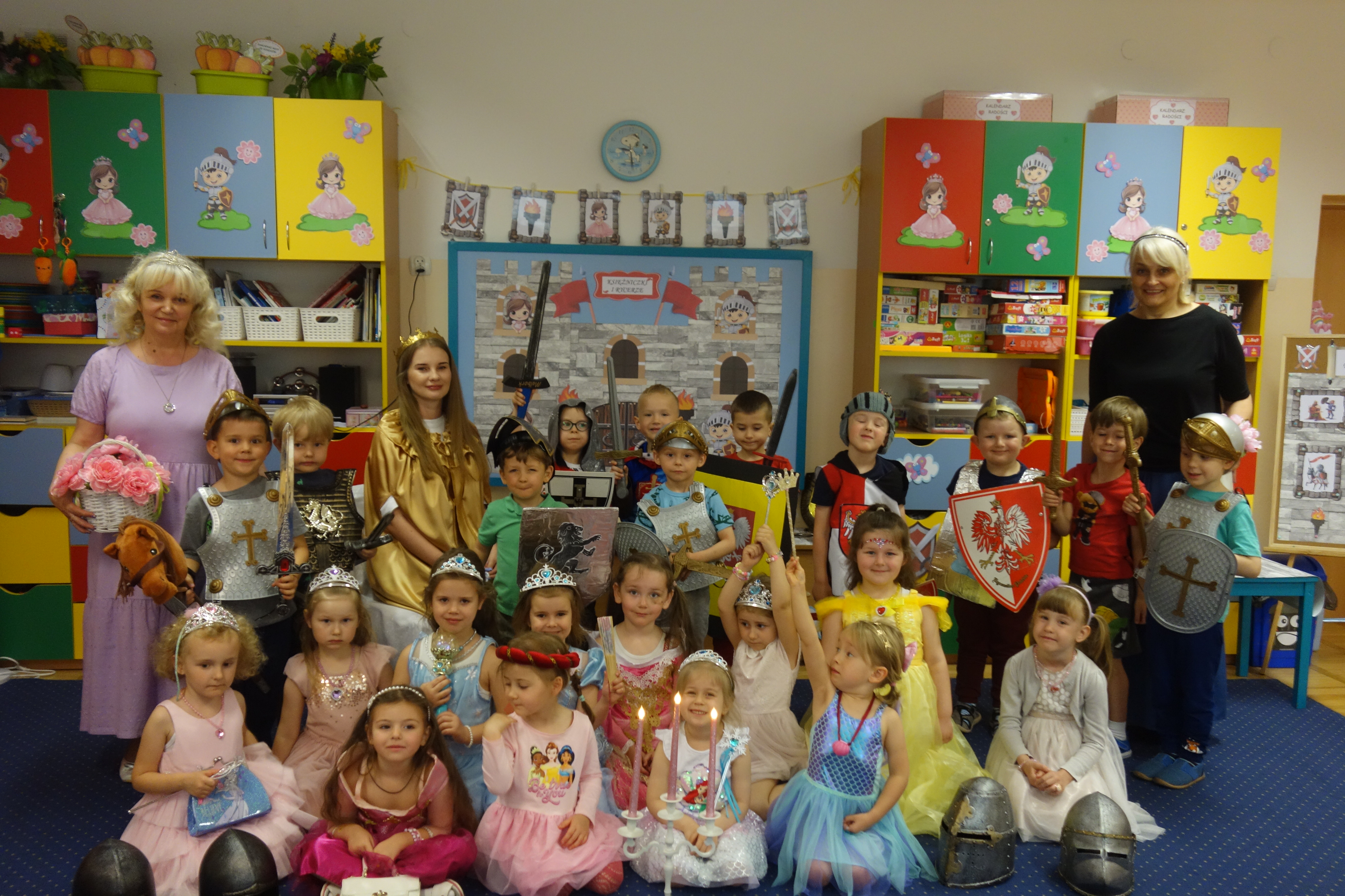 Gościem specjalnym tego dnia była mama Ignacego, która zadbała, by przy okazji beztroskich zabaw, dzieci otrzymały solidną dawkę wiedzy na temat rycerstwa i życia dworskiego. Wspaniale odegrała ona rolę królowej Agaty, do której udaliśmy się po otrzymaniu specjalnego zaproszenia przywiezionego na rumaku przez dzielnego rycerza Kubę. Królowa powitała nas serdecznie na zamku i przy pomocy ksiąg oraz rycin ze swej królewskiej biblioteki opowiedziała dzieciom wiele ciekawych rzeczy o rycerzach, księżniczkach i damach dworu. Misiaki dowiedziały się też jak nazywał się pierwszy król Polski, kim była Jadwiga Andegaweńska, kto mógł zostać rycerzem, czym było pasowanie i jeszcze wielu innych ciekawych faktów historycznych z tamtych, odległych czasów. Potem przed królową zaprezentowały się nasze wspaniałe księżniczki i dzielni rycerze. Królowa Agata zdecydowała o przyznaniu dziewczynkom oficjalnych tytułów książęcych, a chłopców uroczyście pasowała na rycerzy. Z tej okazji księżniczki wykonały taniec z białymi chusteczkami, zakończony zawołaniem „Mój ci on jest!”, który nawiązywał do dawnego zwyczaju. Po takiej deklaracji pań serca szczęśliwi rycerze udali się na turniej, gdzie dali pokaz swojej siły, honoru i męstwa. W tym czasie księżniczki w swojej komnacie zajęły się rękodziełem. W mig powstały zdobne w klejnoty, piękne diademy. Wkrótce wszyscy spotkaliśmy się na balu u królowej Agaty, gdzie nauczyliśmy się tańca dworskiego i sami zaprezentowaliśmy znacznie bardziej żywiołowy taniec przedszkolny. Naszą wizytę na zamku zakończyła biesiada przy wspólnym stole. Misiakom najbardziej smakował kurczak z królewskiej hodowli jedzony, jak przystało na tamte czasy, bez użycia sztućców. Tak przeżyty Dzień Dziecka na długo zostanie nam w pamięci. Mamy nadzieję, że choć trochę spełniły się w ten sposób dziecięce marzenia.