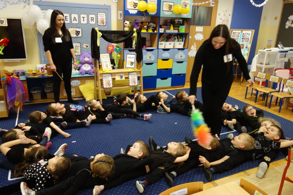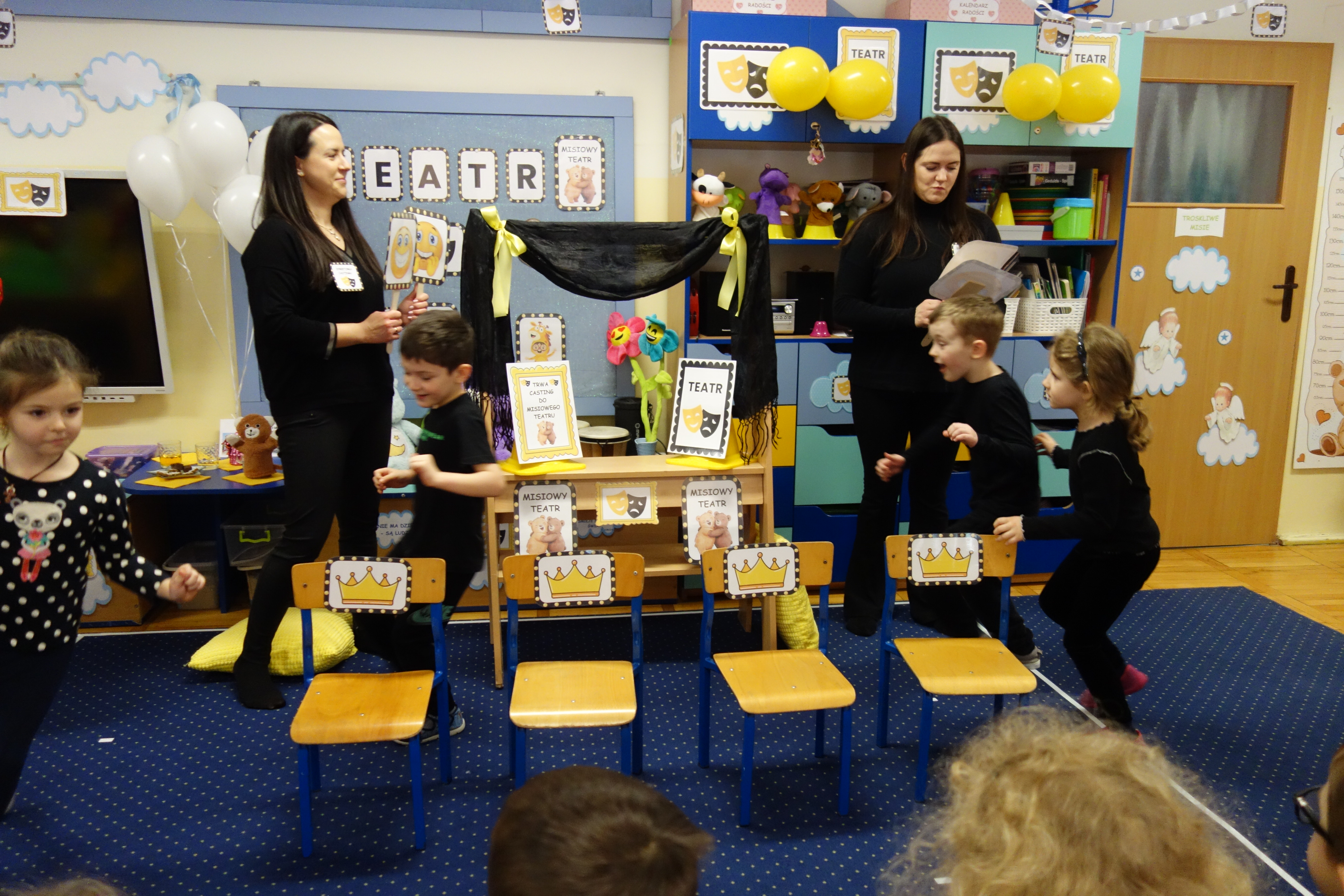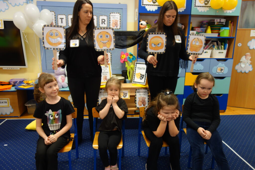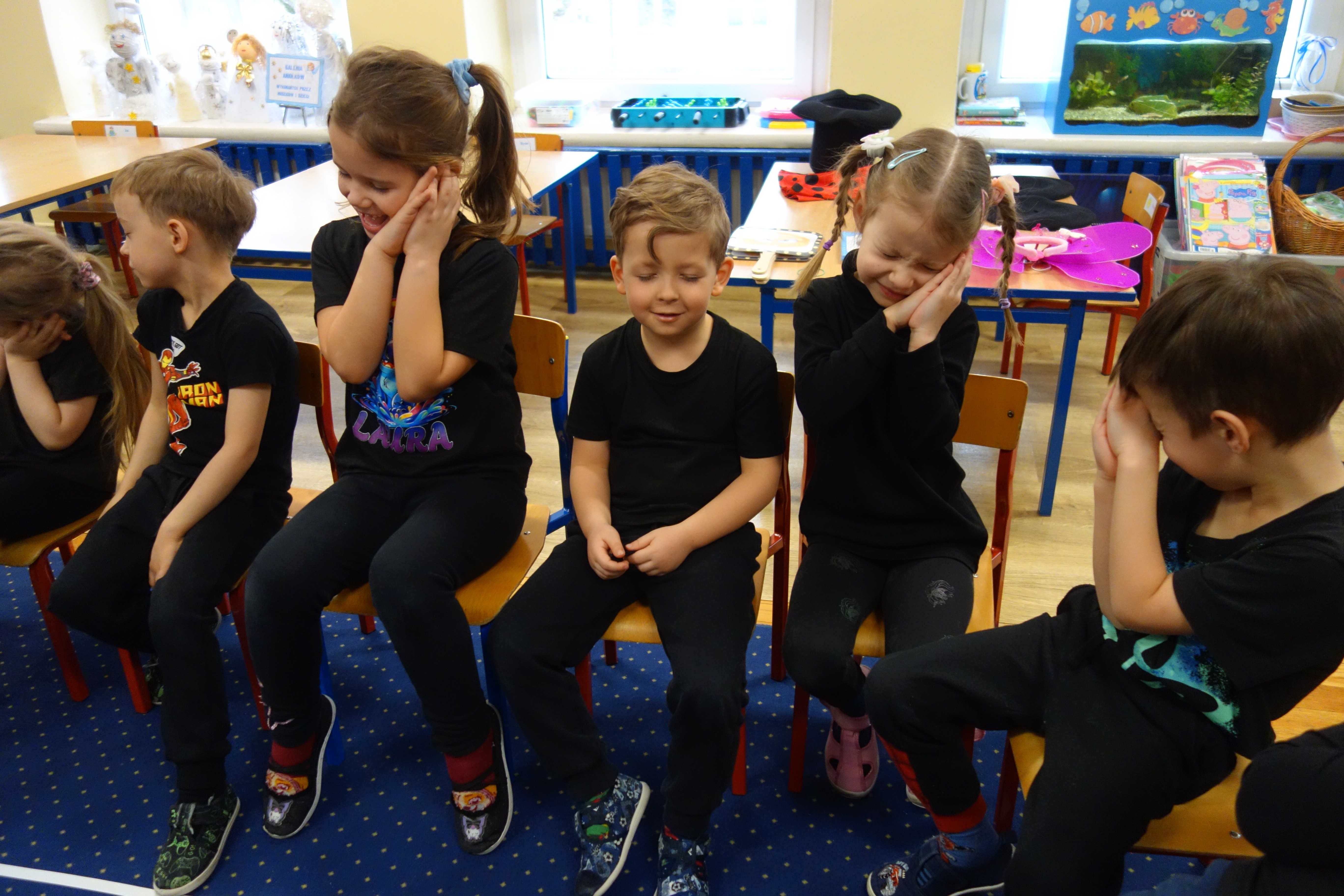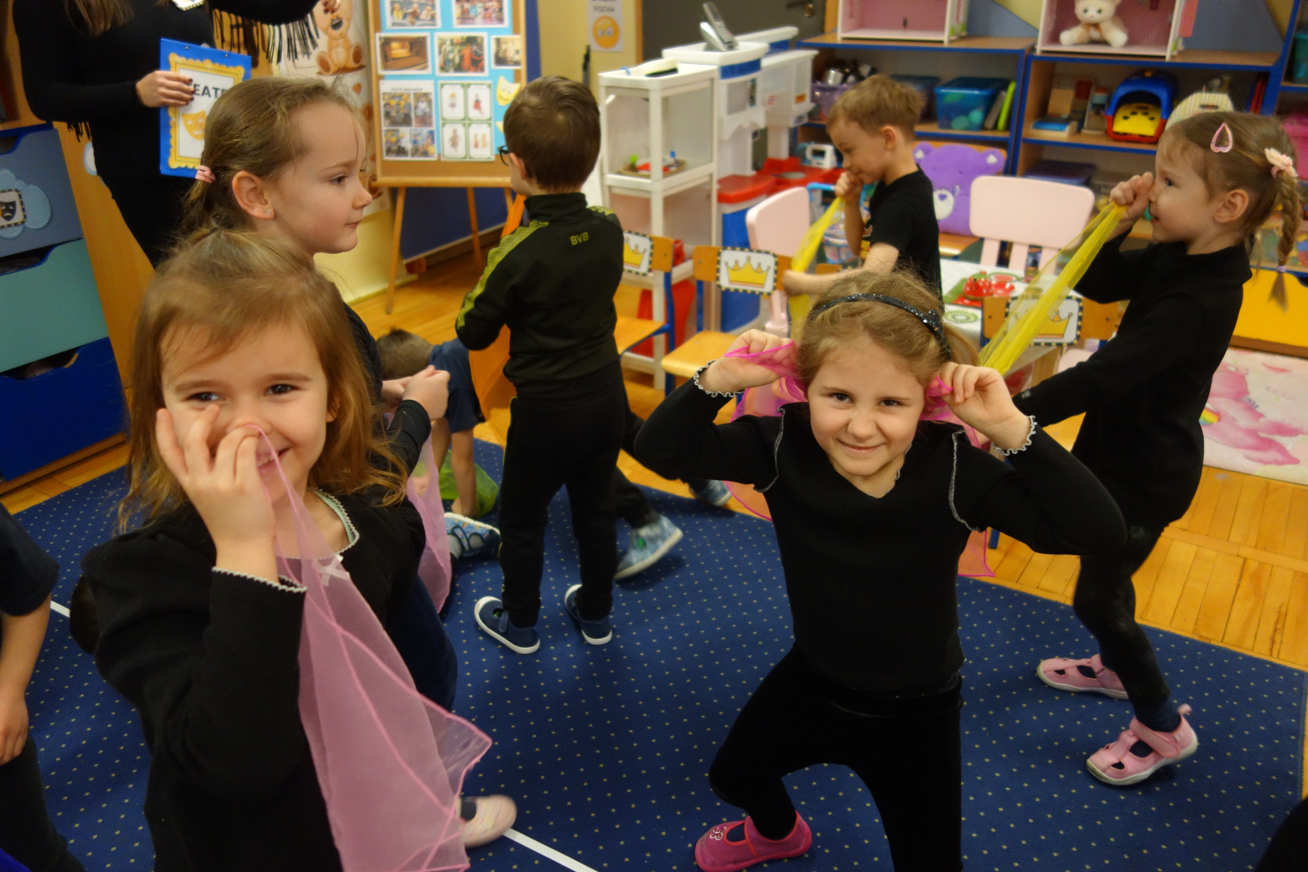 U Troskliwych Misiów od kilku miesięcy trwa realizacja autorskiego projektu „Moc Emocji”. Dzielnie pomagają nam w tym rodzice, niezrażeni różnymi formalnościami. W lutym całego wachlarza przeżyć, Troskliwym Misiom dostarczyły działania parateatralne i zabawa w teatr. Warto odnotować, że w dniu, gdy pojawić się miała na naszych zajęciach „Moc Emocji Małego Aktora” oraz dwie pełne energii mamusie: Aurelki i Kornelki, nie była mile widziana paleta barwnych tekstyliów, ani wyszukanych stylizacji, lecz wygodne stroje w czarnym kolorze.