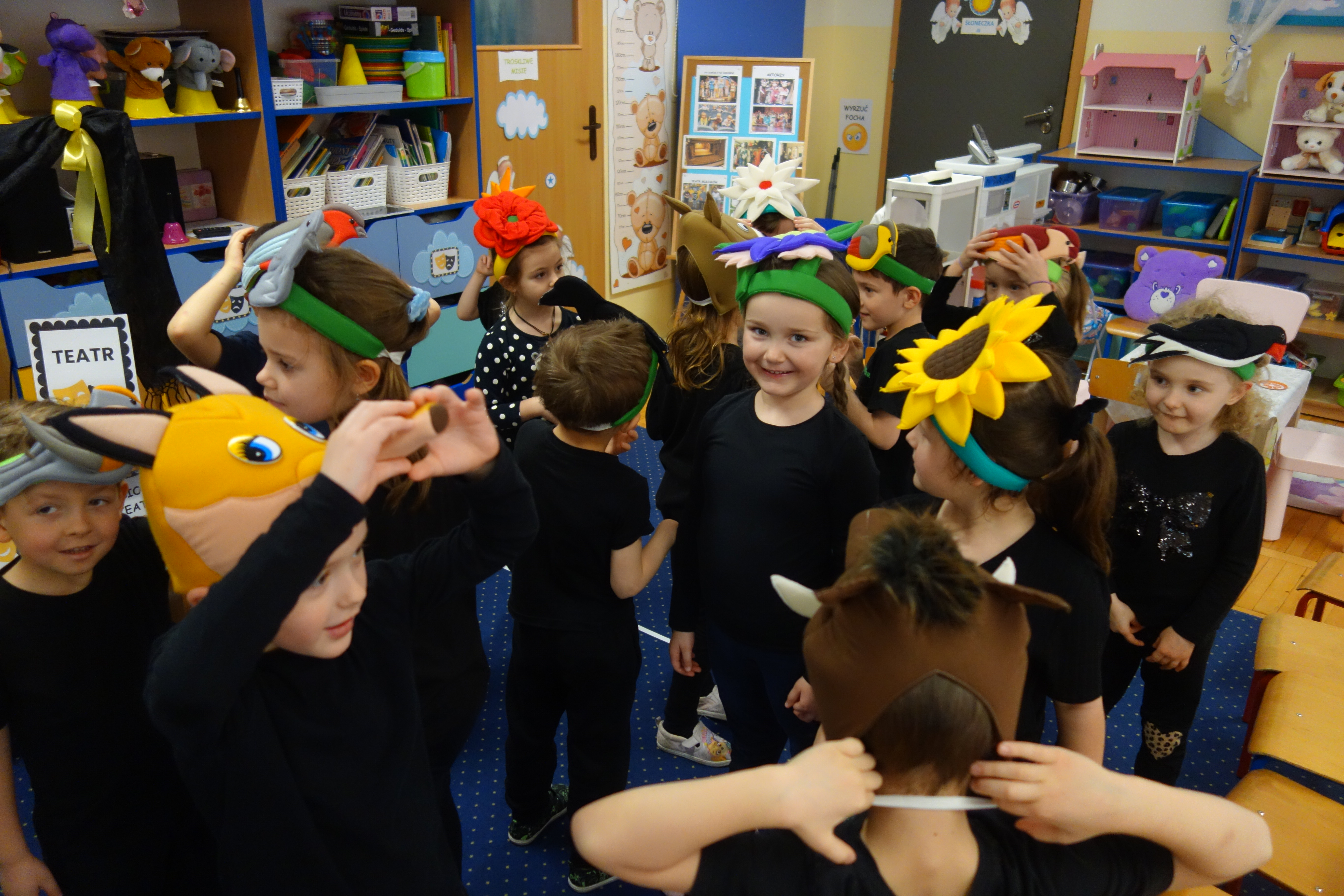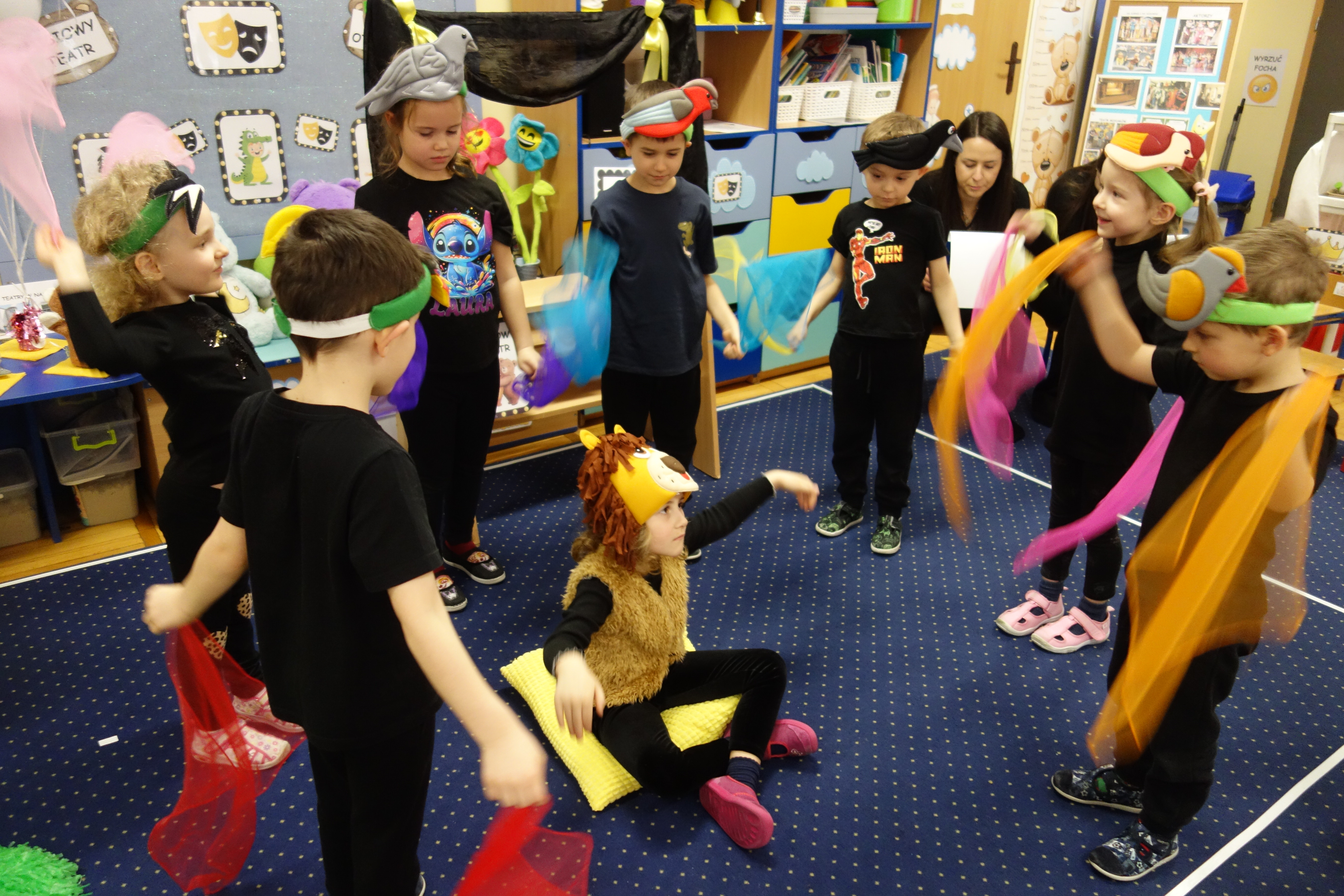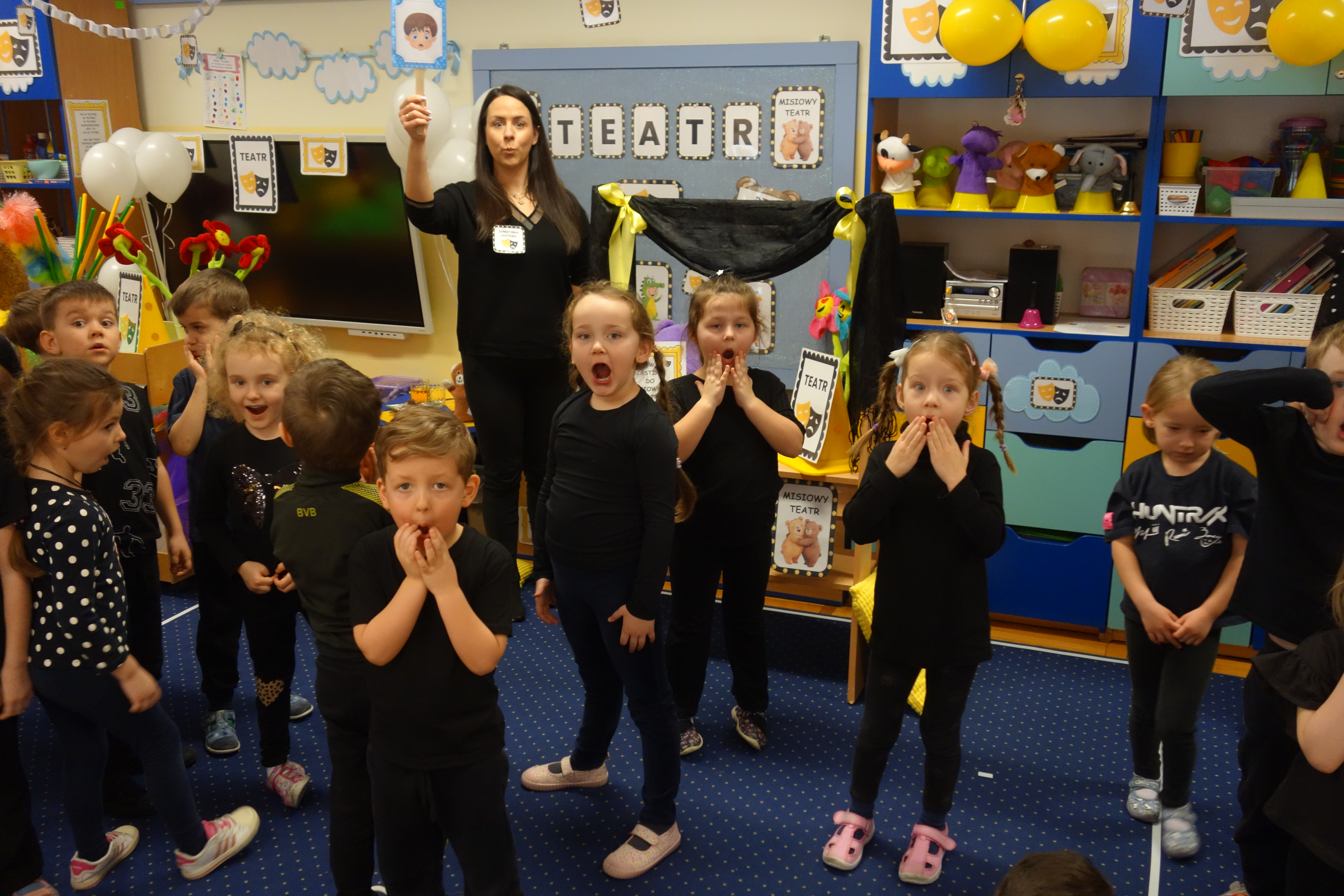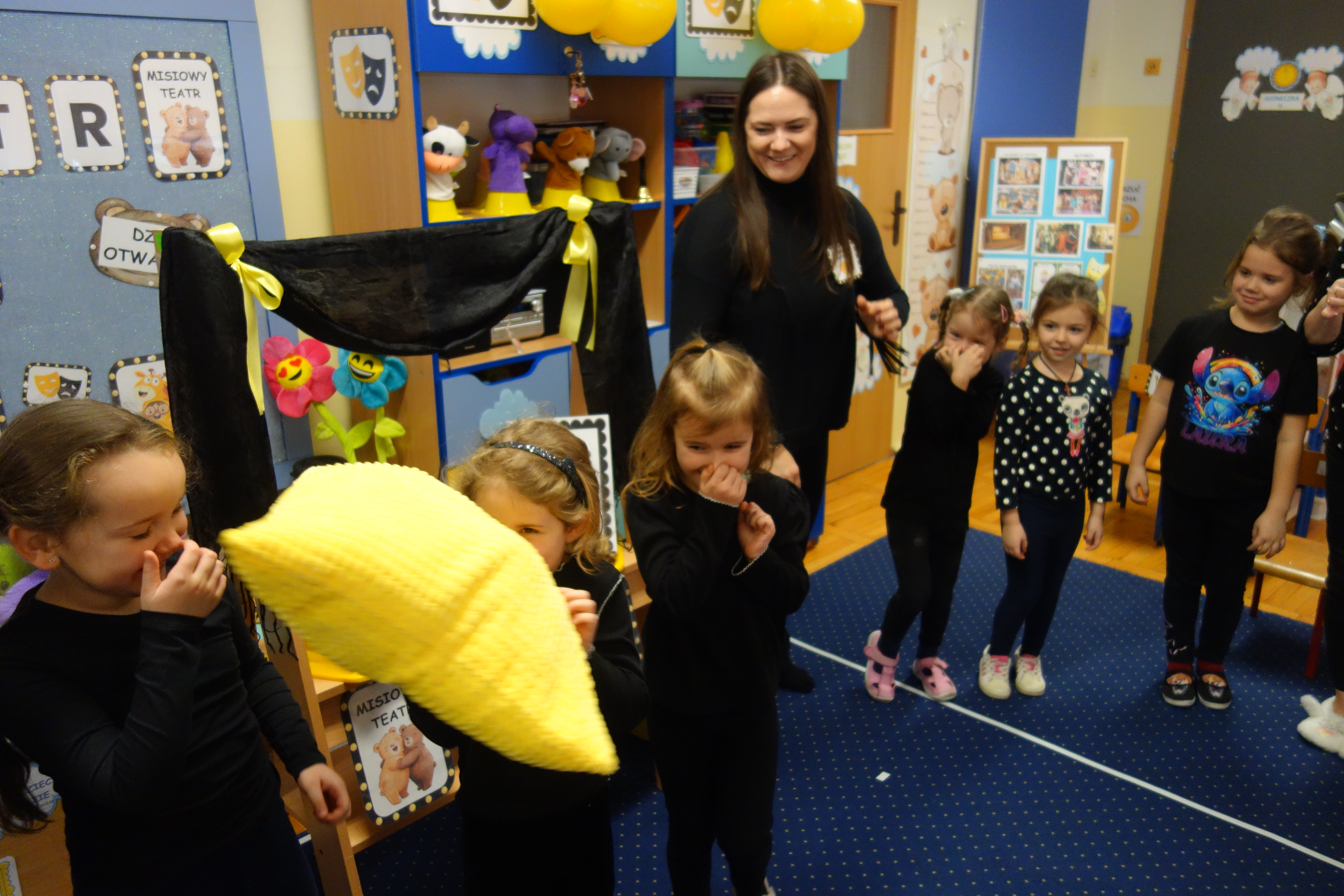 U Troskliwych Misiów od kilku miesięcy trwa realizacja autorskiego projektu „Moc Emocji”. Dzielnie pomagają nam w tym rodzice, niezrażeni różnymi formalnościami. W lutym całego wachlarza przeżyć, Troskliwym Misiom dostarczyły działania parateatralne i zabawa w teatr. Warto odnotować, że w dniu, gdy pojawić się miała na naszych zajęciach „Moc Emocji Małego Aktora” oraz dwie pełne energii mamusie: Aurelki i Kornelki, nie była mile widziana paleta barwnych tekstyliów, ani wyszukanych stylizacji, lecz wygodne stroje w czarnym kolorze.