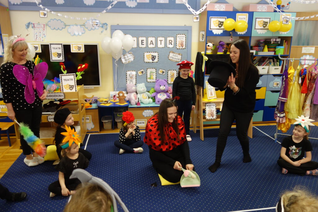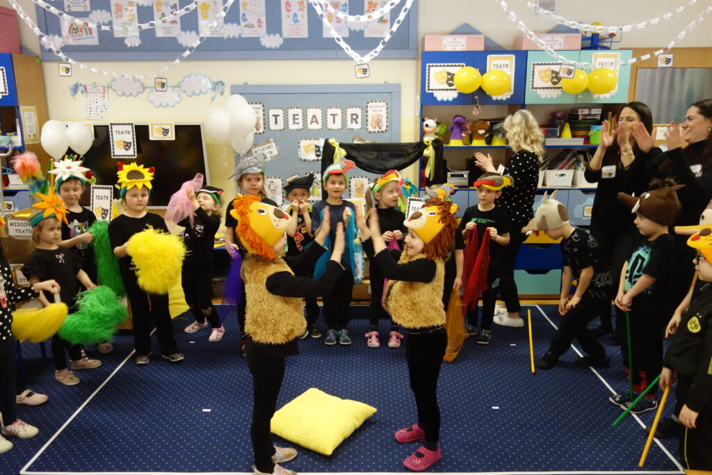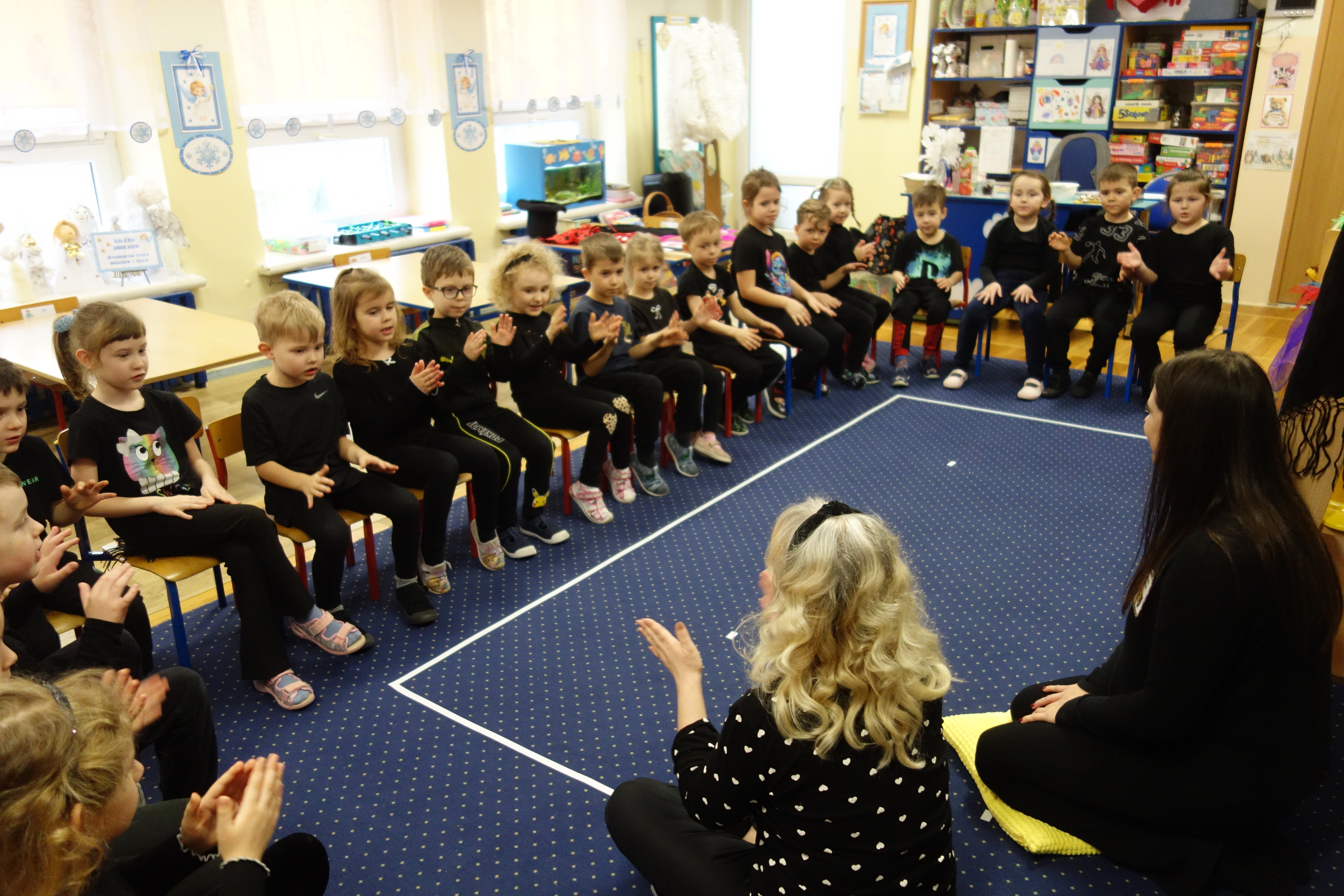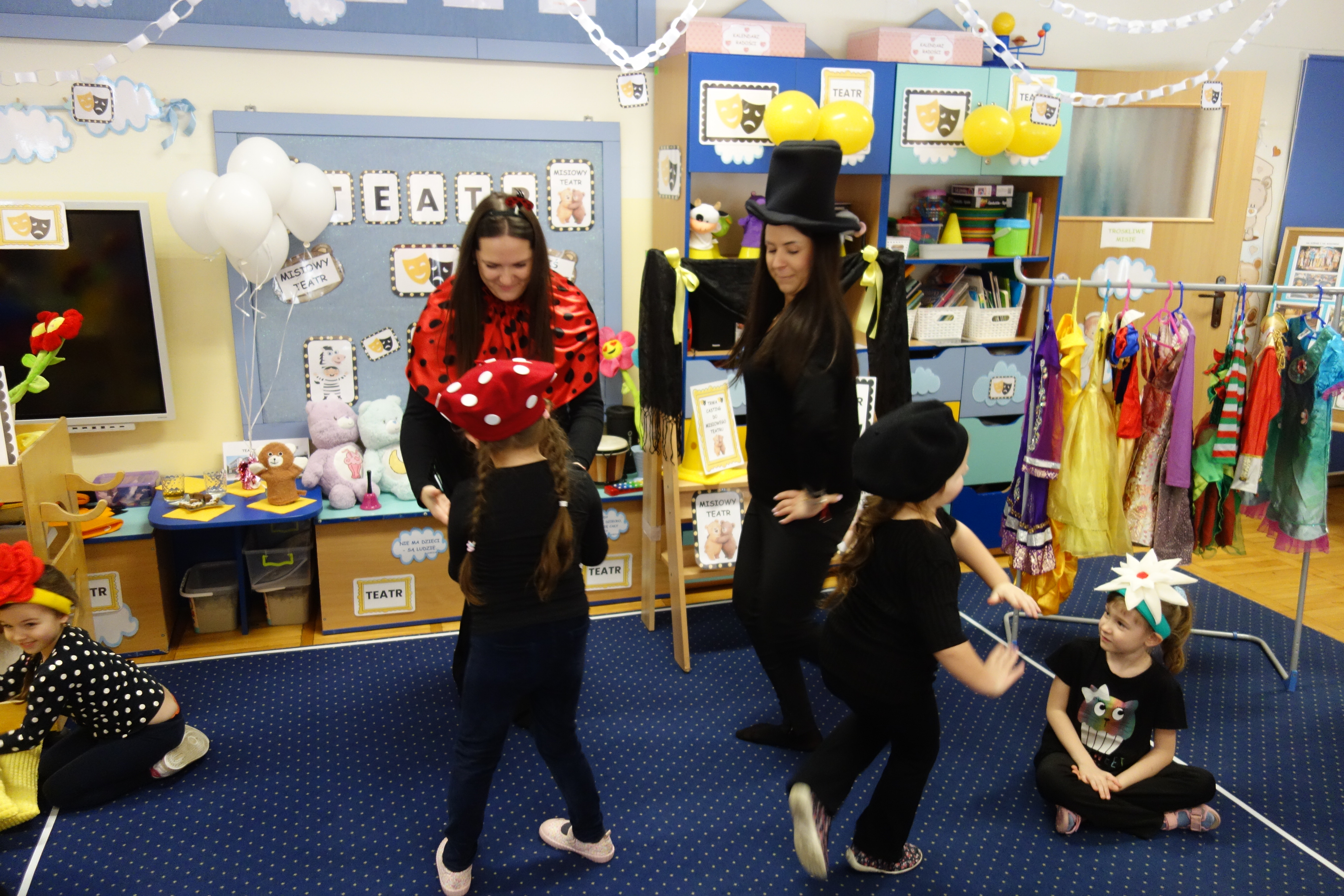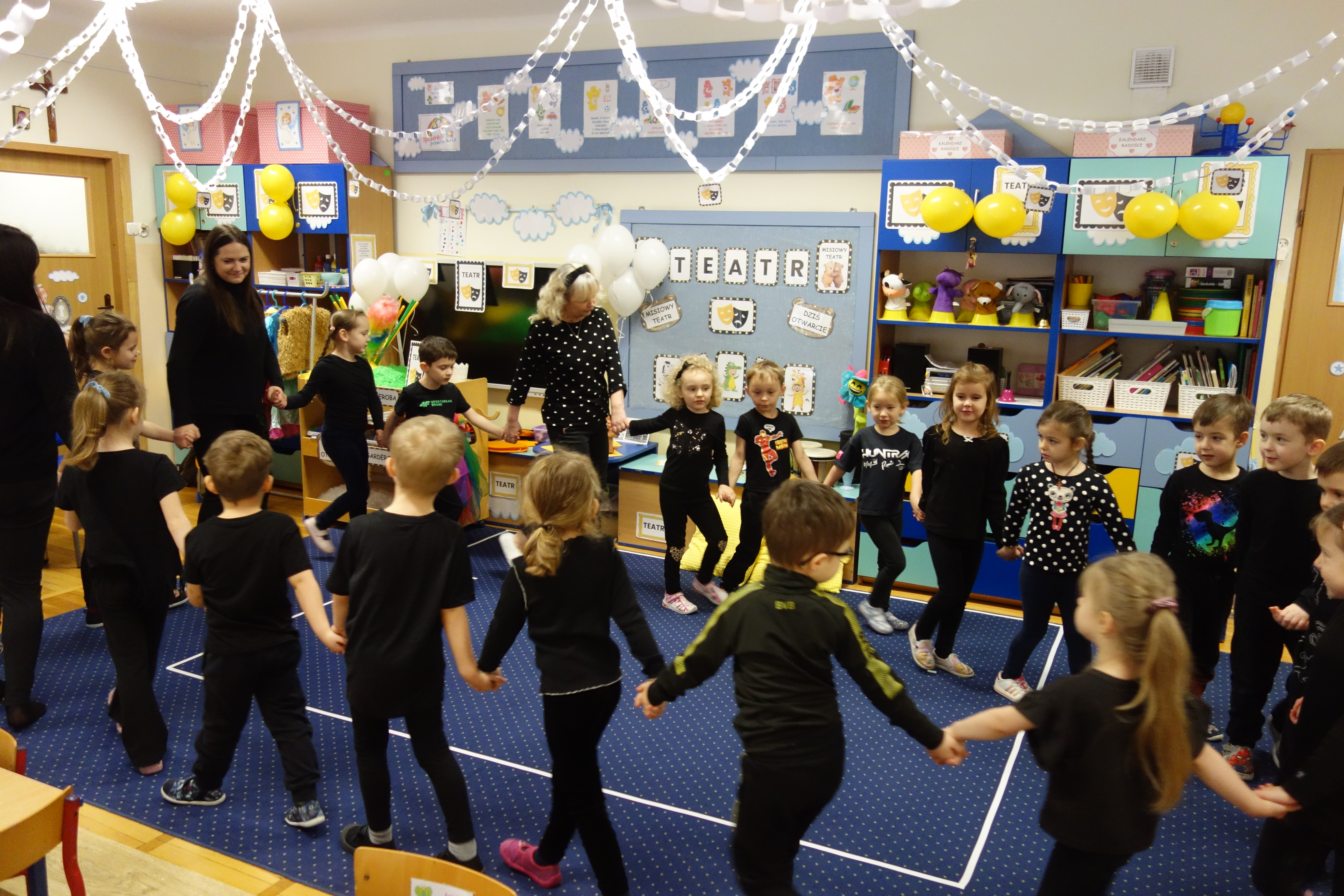 U Troskliwych Misiów od kilku miesięcy trwa realizacja autorskiego projektu „Moc Emocji”. Dzielnie pomagają nam w tym rodzice, niezrażeni różnymi formalnościami. W lutym całego wachlarza przeżyć, Troskliwym Misiom dostarczyły działania parateatralne i zabawa w teatr. Warto odnotować, że w dniu, gdy pojawić się miała na naszych zajęciach „Moc Emocji Małego Aktora” oraz dwie pełne energii mamusie: Aurelki i Kornelki, nie była mile widziana paleta barwnych tekstyliów, ani wyszukanych stylizacji, lecz wygodne stroje w czarnym kolorze.