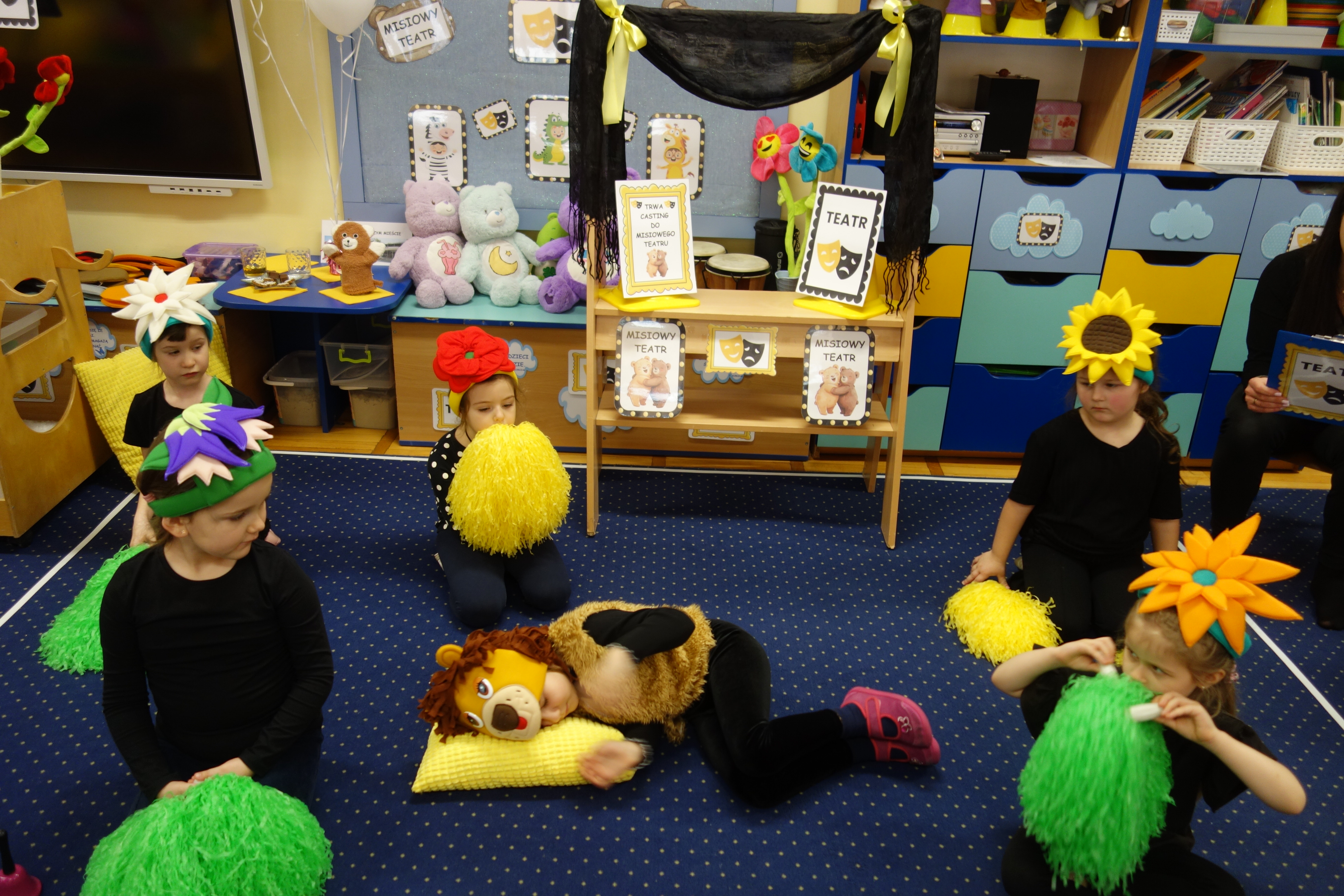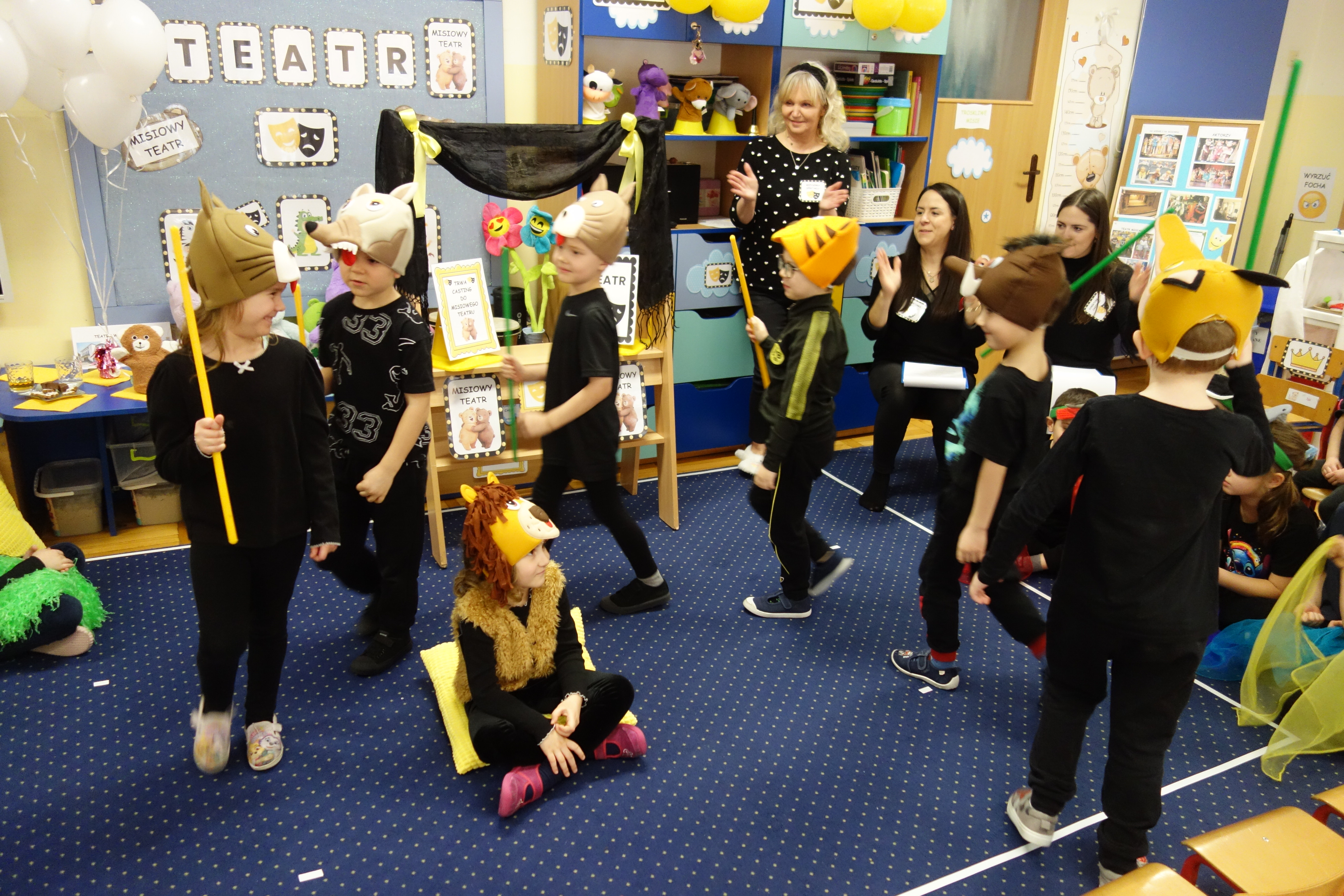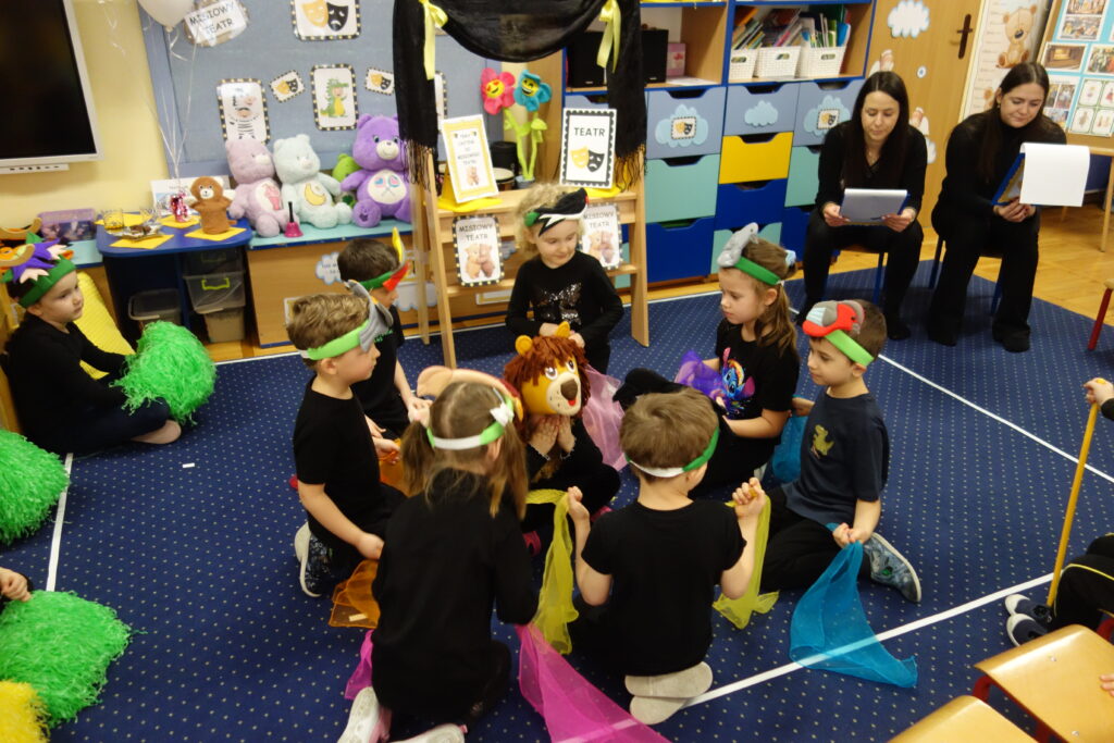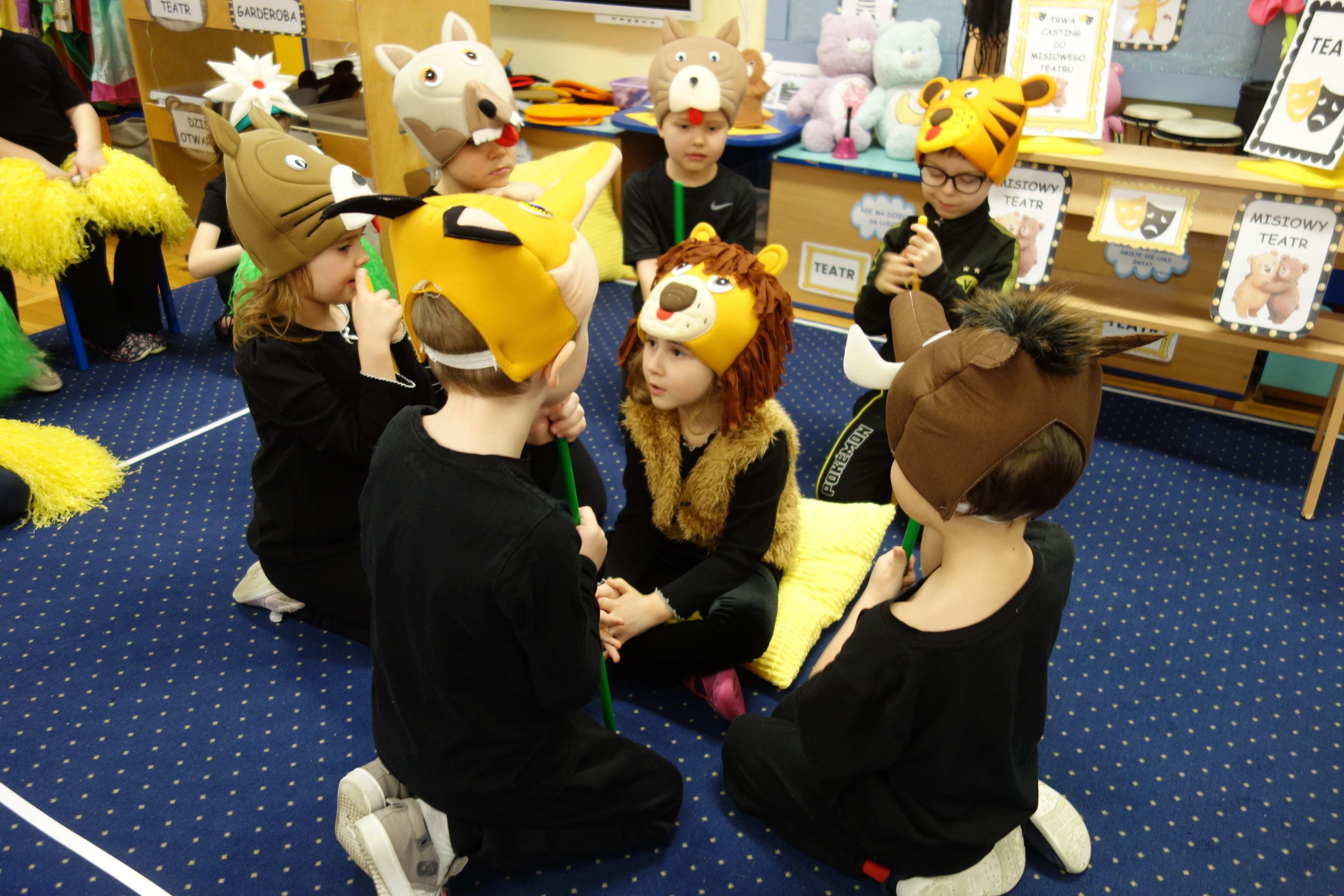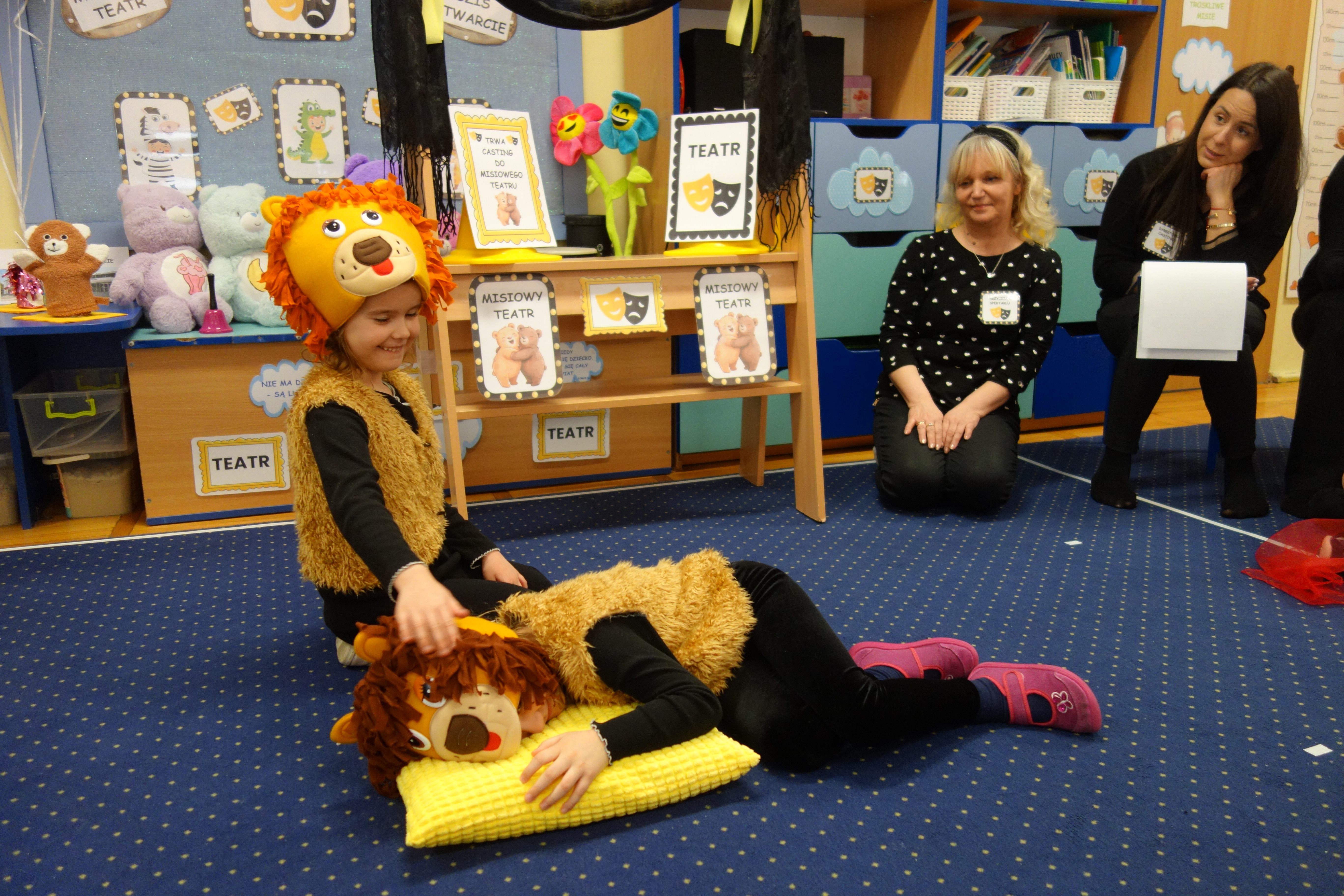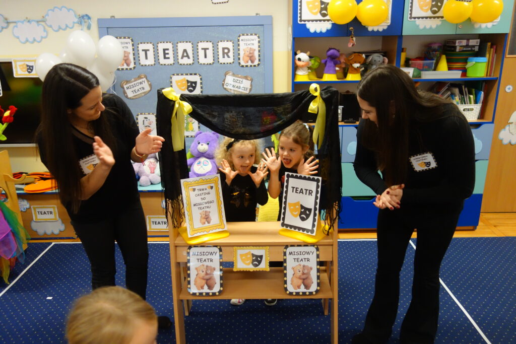 Po wesołych powitankach z mamami, które pozwoliły dzieciom wejść w radosny nastrój oraz uruchomić różne części ciała i poczuć je, Misiowa Pani ogłosiła, że w pobliżu otwiera się teatr, do którego poszukiwani są dziecięcy aktorzy. W tej sprawie zjawiła się też u nas pani manager teatru. Wszystkie Troskliwe Misie natychmiast zgłosiły gotowość do podjęcia pracy i udały się z nią na casting. Szczęśliwie zdążyliśmy na otwarcie Misiowego Teatru, ale na świętowanie nie było zbyt wiele czasu, bowiem dyrekcja teatru przygotowała Misiakom liczne testy castingowe. Poprzez różne treningi mali aktorzy mogli pokazać możliwości swojej twarzy, ciała oraz głosu. Nie zabrakło też ćwiczeń oddechu i dykcji. Ponieważ tworzenie teatru to praca zespołowa, Misiaki udowodniły, że potrafią współdziałać z innymi i liczyć się ze swoimi scenicznymi partnerami. Próbowały też za pomocą głosu, mimiki i gestów przekazywać różne emocje i odgrywały krótkie etiudy. Wszystkiemu przyglądały się zadowolone dyrektorki castingu i pani reżyser, które zaprosiły dzieci do następnego etapu.
