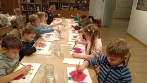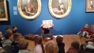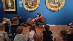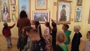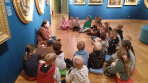 Dzięki opowieściom snutym przez Panią Anię, czyli naszego przewodnika, dowiedzieliśmy się kim jest malarz i czego potrzebuje do swojej pracy. Poznaliśmy też materiały i narzędzia, w które wyposażona jest pracownia artysty oraz od czego należy zacząć, by namalować obraz. Następnie obejrzeliśmy dzieła tworzące wystawę. Próbowaliśmy nawet wskazać wśród nich obrazy olejne, grafiki i akwarele. Przechadzając się po salach muzealnych dowiedzieliśmy się, że obrazy wymagają odpowiedniej temperatury powietrza, wilgotności oraz właściwego oświetlenia.