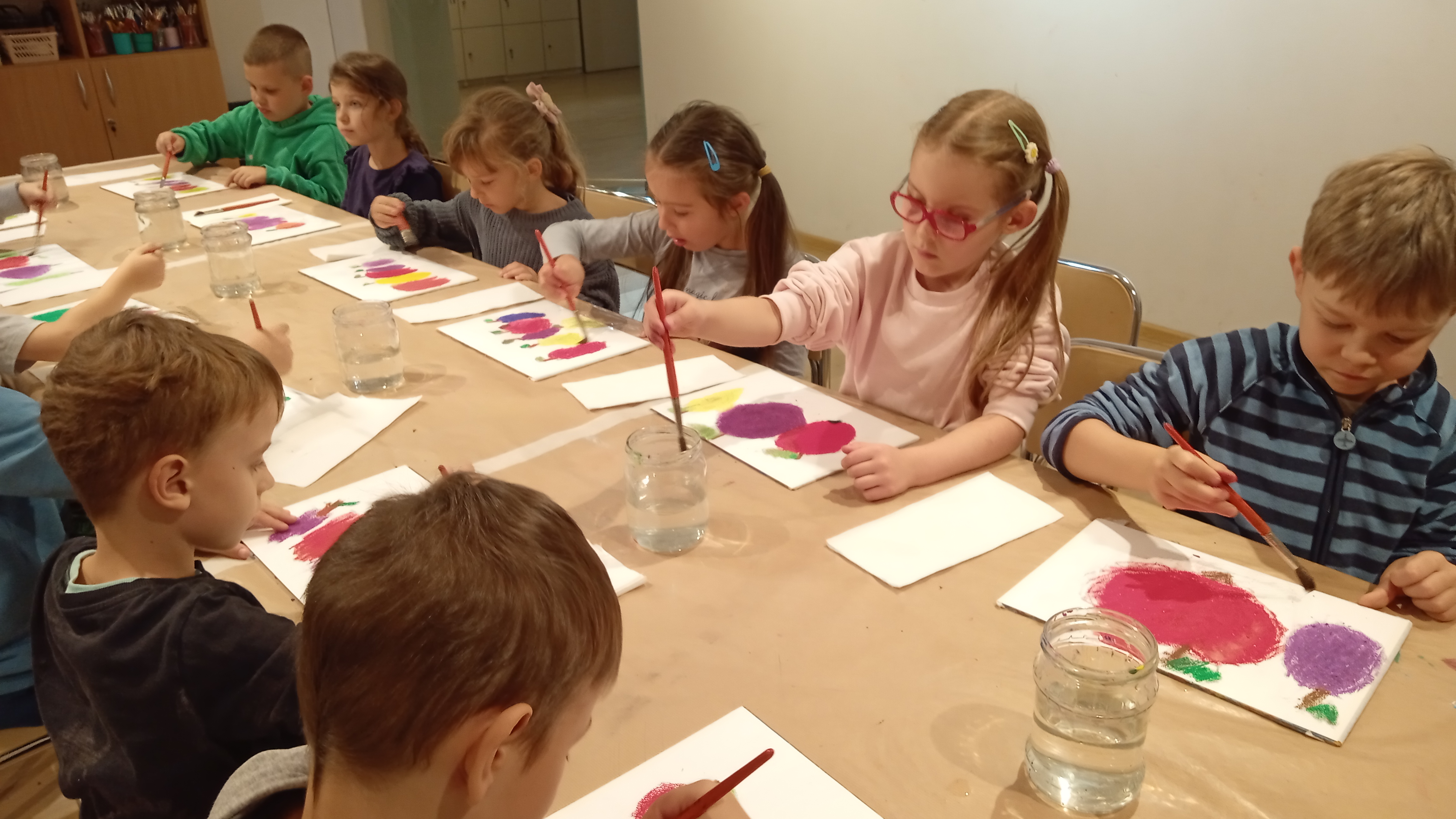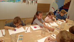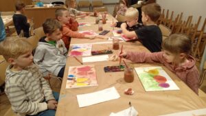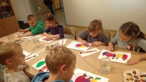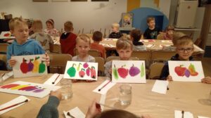 Wzbogaceni w nową wiedzę, krętymi schodkami wyruszyliśmy do kolejnej sali, a właściwie pracowni malarskiej. Na specjalnie przygotowanych stanowiskach czekały na nas fakturowane kartki, olejne pastele, pędzle, słoiczki z wodą i akwarele. Zanim przystąpiliśmy do malowania, Pani Ania – prowadząca warsztaty, bardzo dokładnie wyjaśniła nam poszczególne etapy naszych działań. Nie były trudne ani zbyt skomplikowane. Błysk w oczach świadczył, że bardzo nam się podobało w pracowni „Małego malarza”. W jednej sekundzie poczuliśmy wenę twórczą. Za chwilę każdy z nas miał szansę stać się prawdziwym malarzem i samodzielnie stworzyć obraz zwany „martwą naturą”. Po kwadransie, na kartkach zagościły rumiane jabłka, pękate gruszki i smukłe śliweczki. Intensywność kolorów czyniła je soczystymi i bardzo apetycznymi. Jeszcze listeczek na wiotkiej gałązce i obraz prawie gotowy. Odkładamy pastele i zabieramy się za malowanie tła. Tu posługujemy się pędzlem i akwarelami. Najpierw całą kartkę zaciągamy wodą, a następnie nakładamy na nią niewielkie, kolorowe kleksy. W ten sposób kolory zaczynają się przenikać, tworząc prawdziwie jesienne tło. Jeszcze tylko autograf i obraz można odłożyć do suszarni.