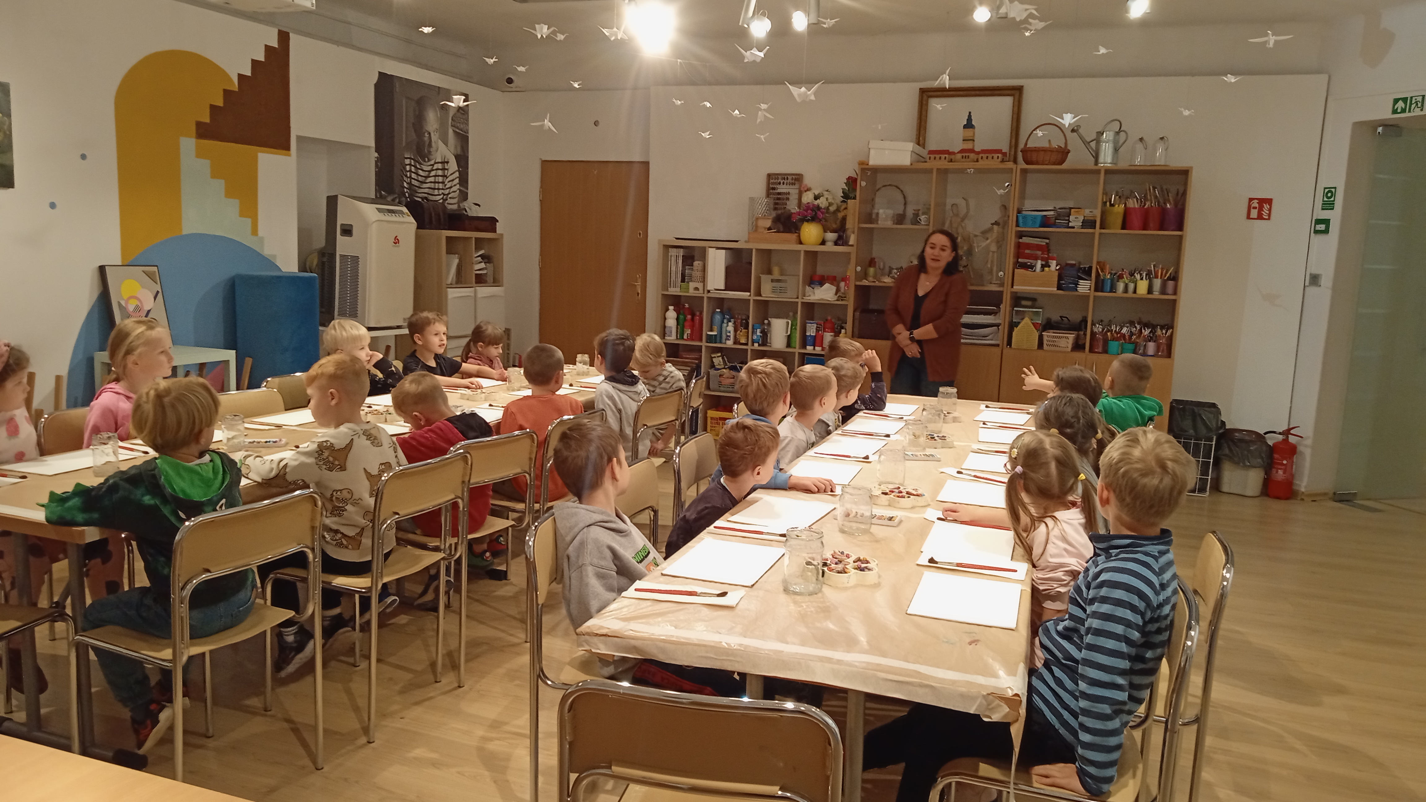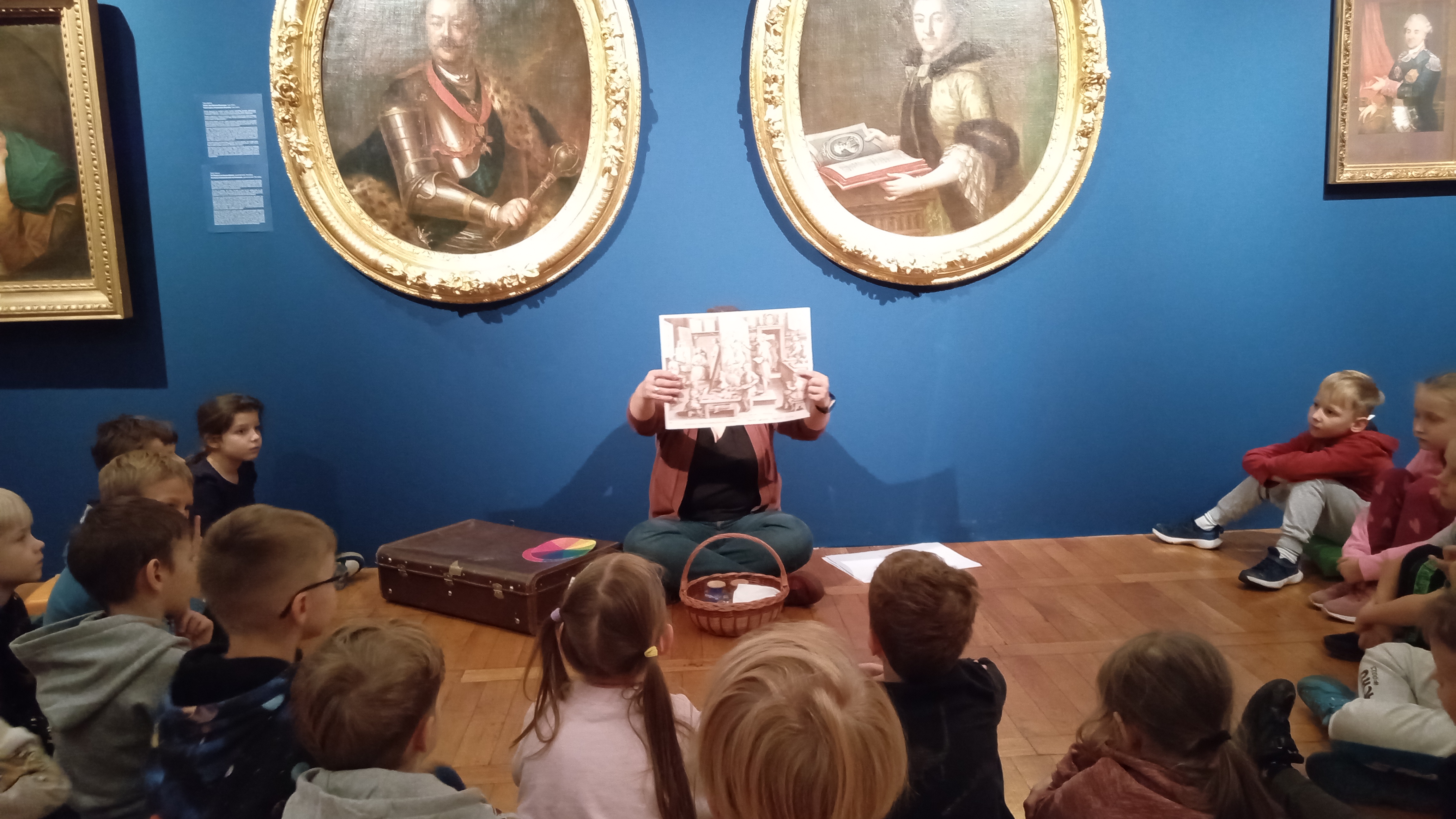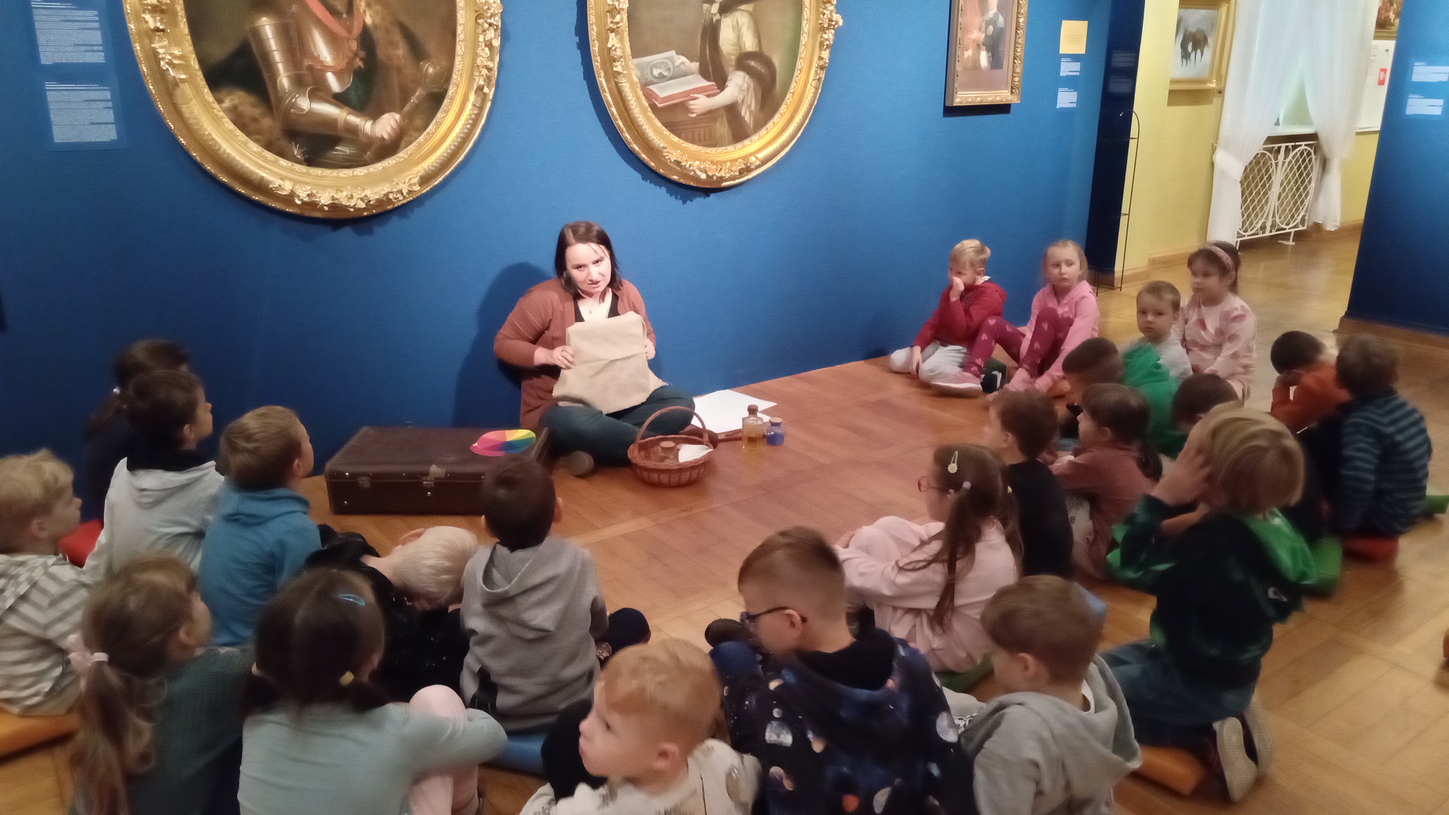 Dzięki opowieściom snutym przez Panią Anię, czyli naszego przewodnika, dowiedzieliśmy się kim jest malarz i czego potrzebuje do swojej pracy. Poznaliśmy też materiały i narzędzia, w które wyposażona jest pracownia artysty oraz od czego należy zacząć, by namalować obraz. Następnie obejrzeliśmy dzieła tworzące wystawę. Próbowaliśmy nawet wskazać wśród nich obrazy olejne, grafiki i akwarele. Przechadzając się po salach muzealnych dowiedzieliśmy się, że obrazy wymagają odpowiedniej temperatury powietrza, wilgotności oraz właściwego oświetlenia.