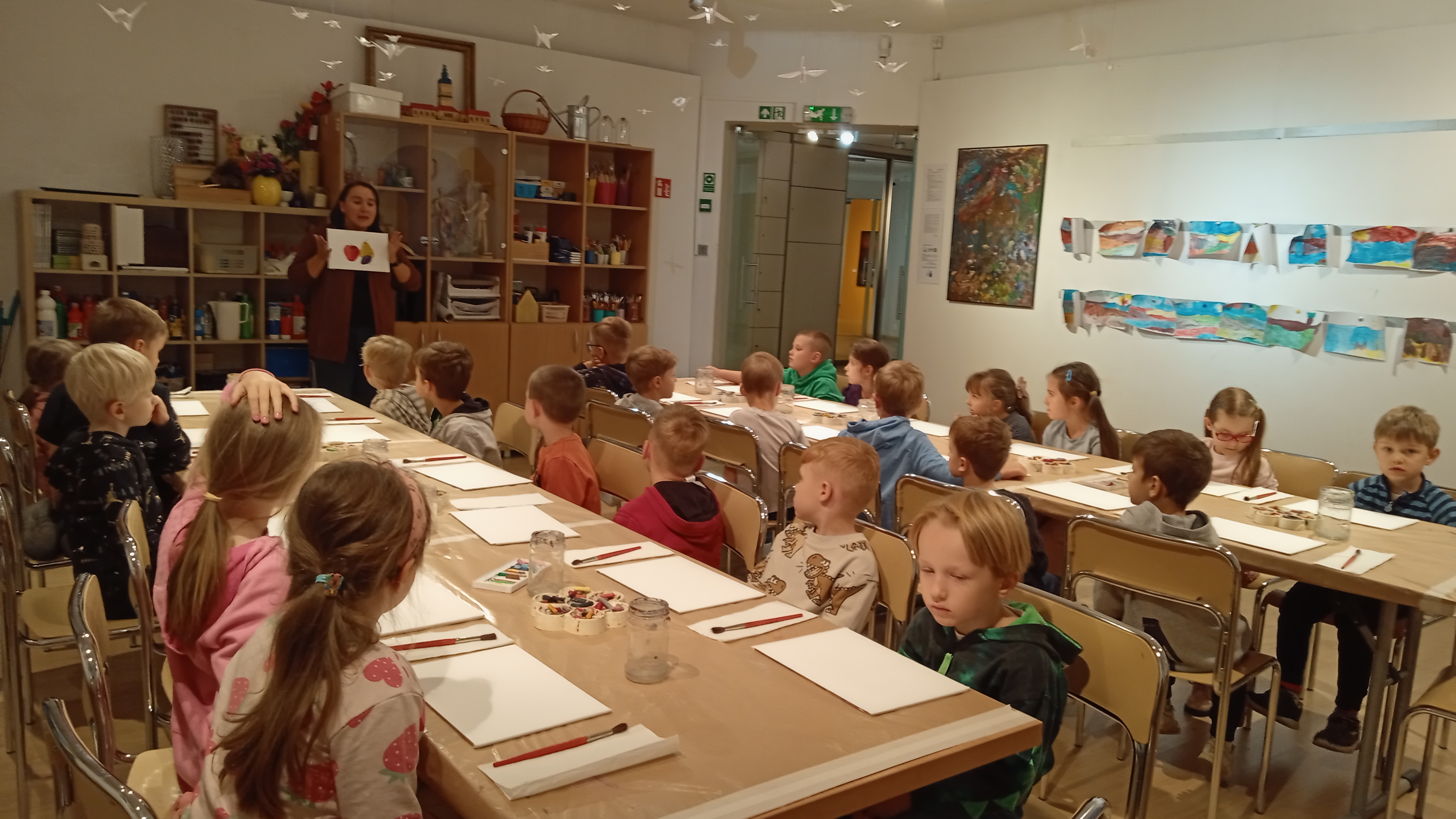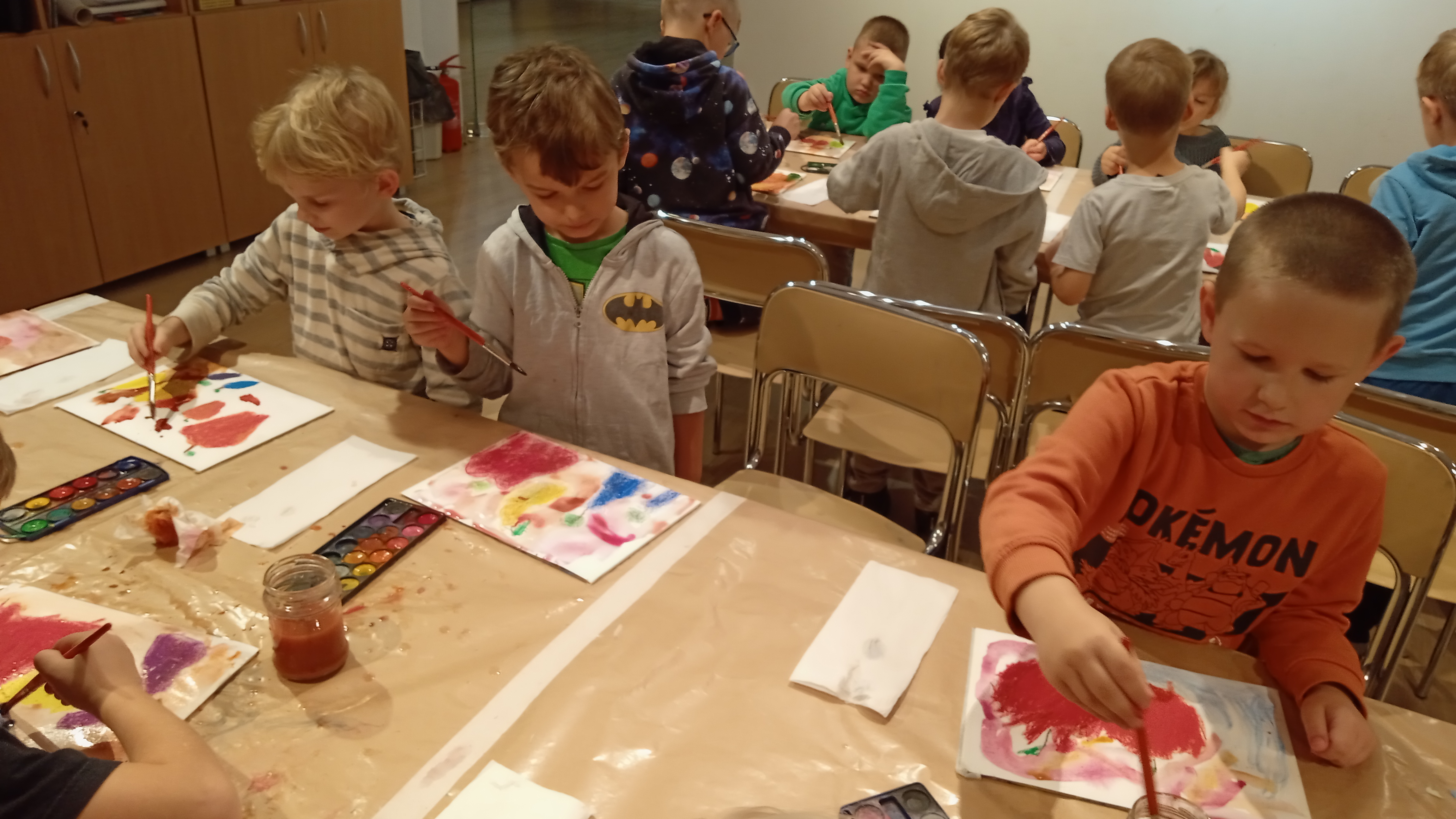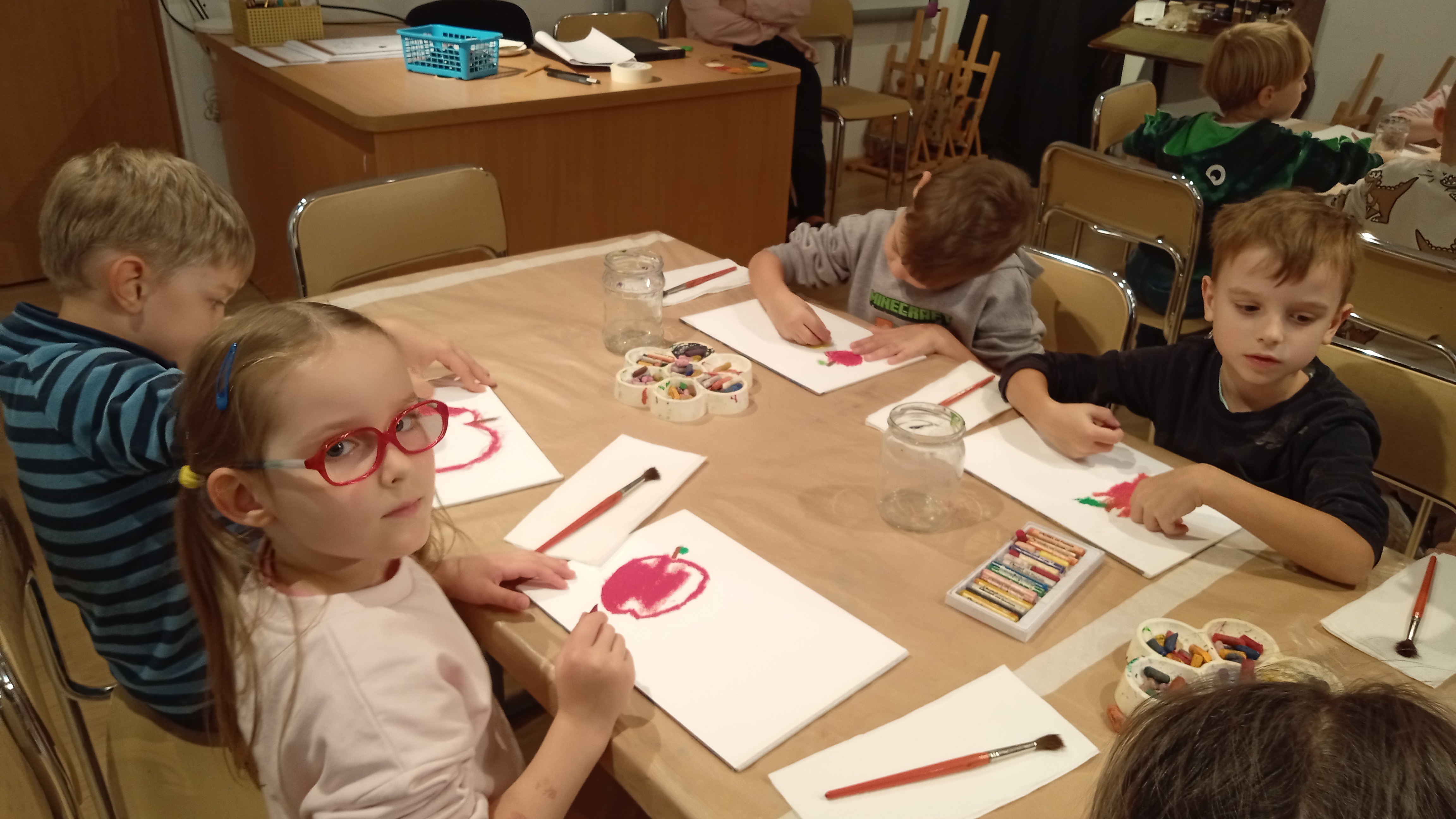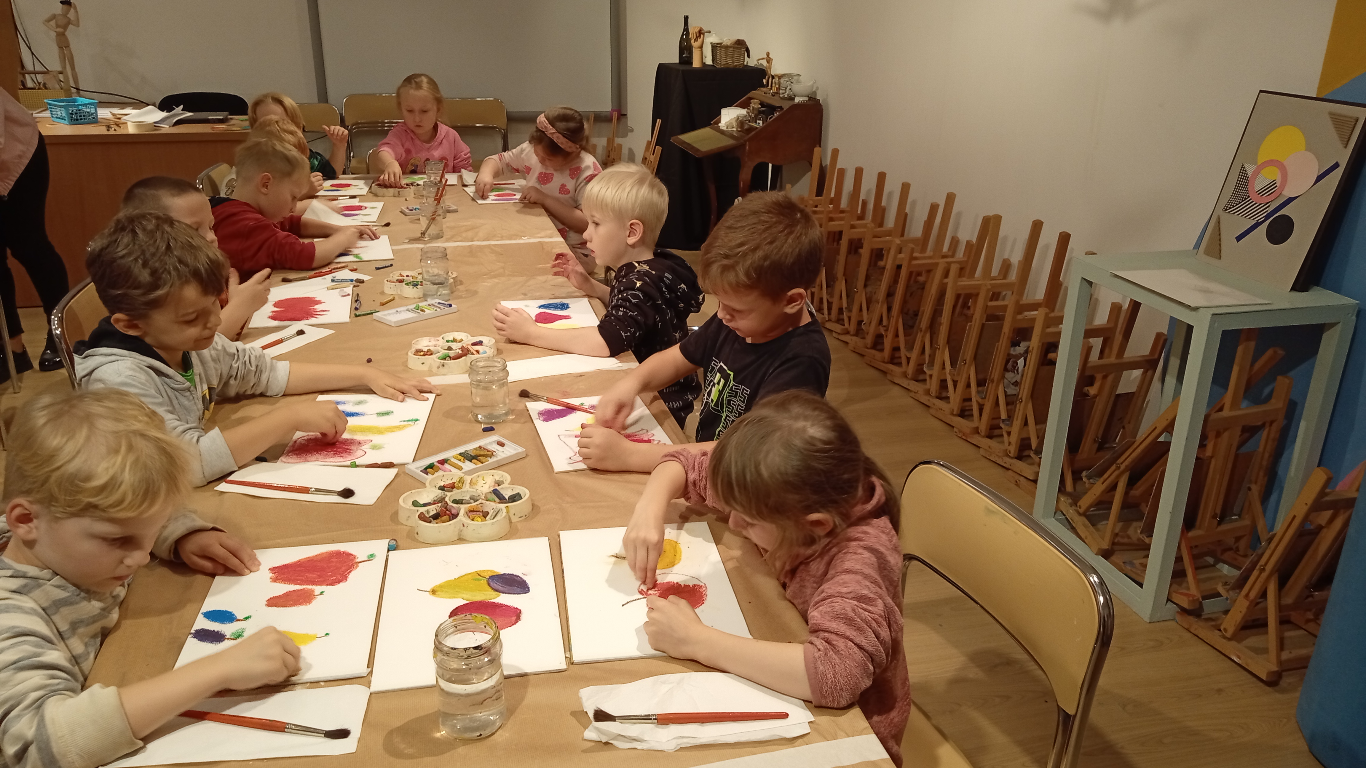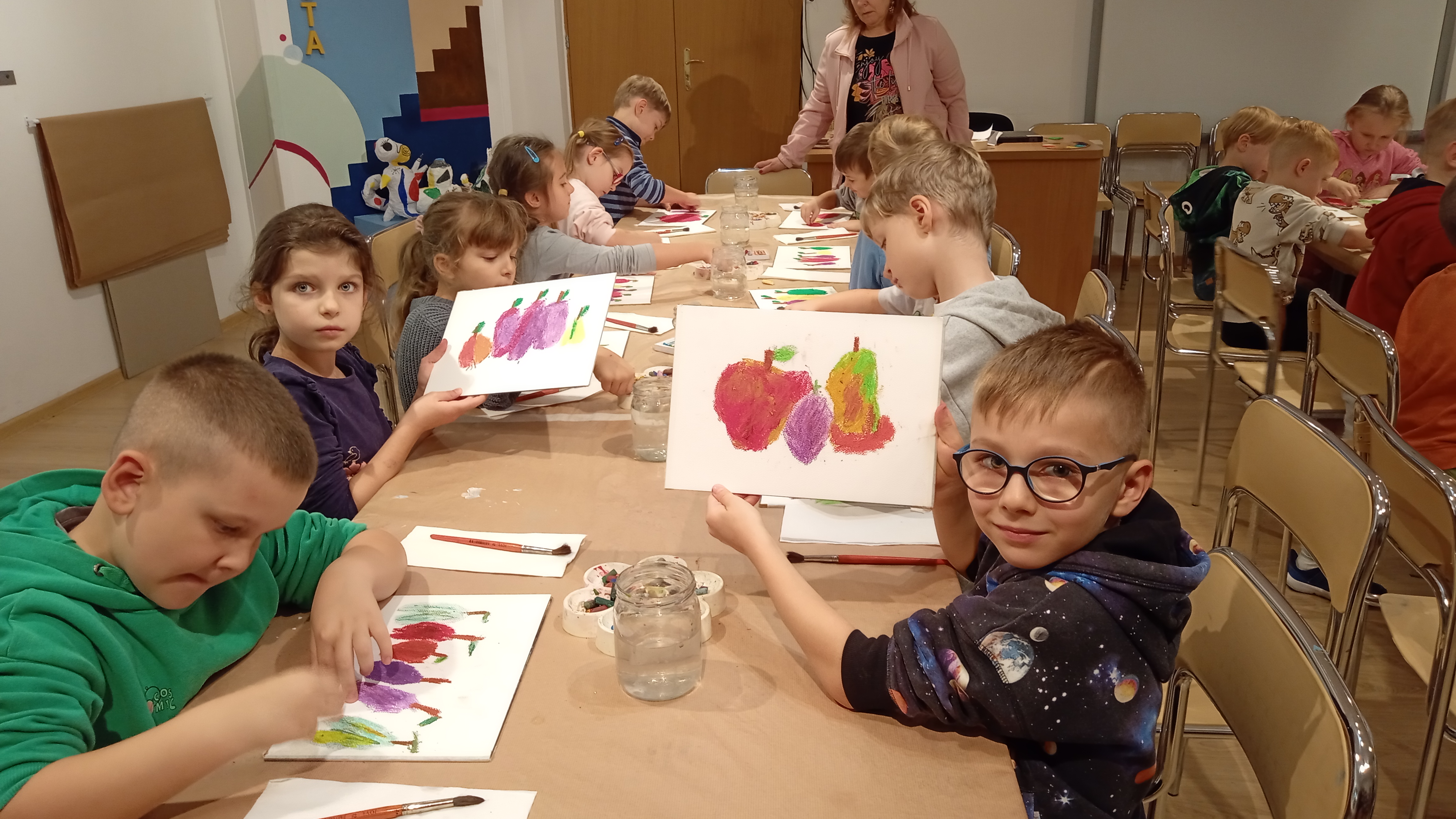 Wzbogaceni w nową wiedzę, krętymi schodkami wyruszyliśmy do kolejnej sali, a właściwie pracowni malarskiej. Na specjalnie przygotowanych stanowiskach czekały na nas fakturowane kartki, olejne pastele, pędzle, słoiczki z wodą i akwarele. Zanim przystąpiliśmy do malowania, Pani Ania – prowadząca warsztaty, bardzo dokładnie wyjaśniła nam poszczególne etapy naszych działań. Nie były trudne ani zbyt skomplikowane. Błysk w oczach świadczył, że bardzo nam się podobało w pracowni „Małego malarza”. W jednej sekundzie poczuliśmy wenę twórczą. Za chwilę każdy z nas miał szansę stać się prawdziwym malarzem i samodzielnie stworzyć obraz zwany „martwą naturą”. Po kwadransie, na kartkach zagościły rumiane jabłka, pękate gruszki i smukłe śliweczki. Intensywność kolorów czyniła je soczystymi i bardzo apetycznymi. Jeszcze listeczek na wiotkiej gałązce i obraz prawie gotowy. Odkładamy pastele i zabieramy się za malowanie tła. Tu posługujemy się pędzlem i akwarelami. Najpierw całą kartkę zaciągamy wodą, a następnie nakładamy na nią niewielkie, kolorowe kleksy. W ten sposób kolory zaczynają się przenikać, tworząc prawdziwie jesienne tło. Jeszcze tylko autograf i obraz można odłożyć do suszarni.
