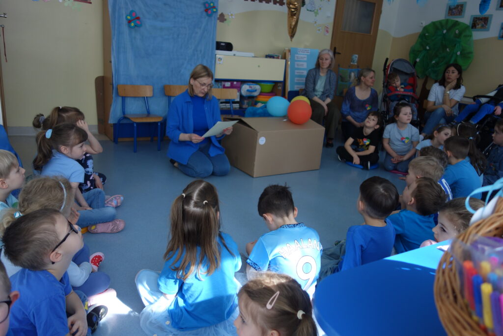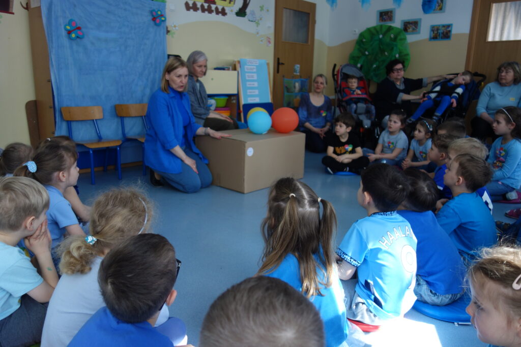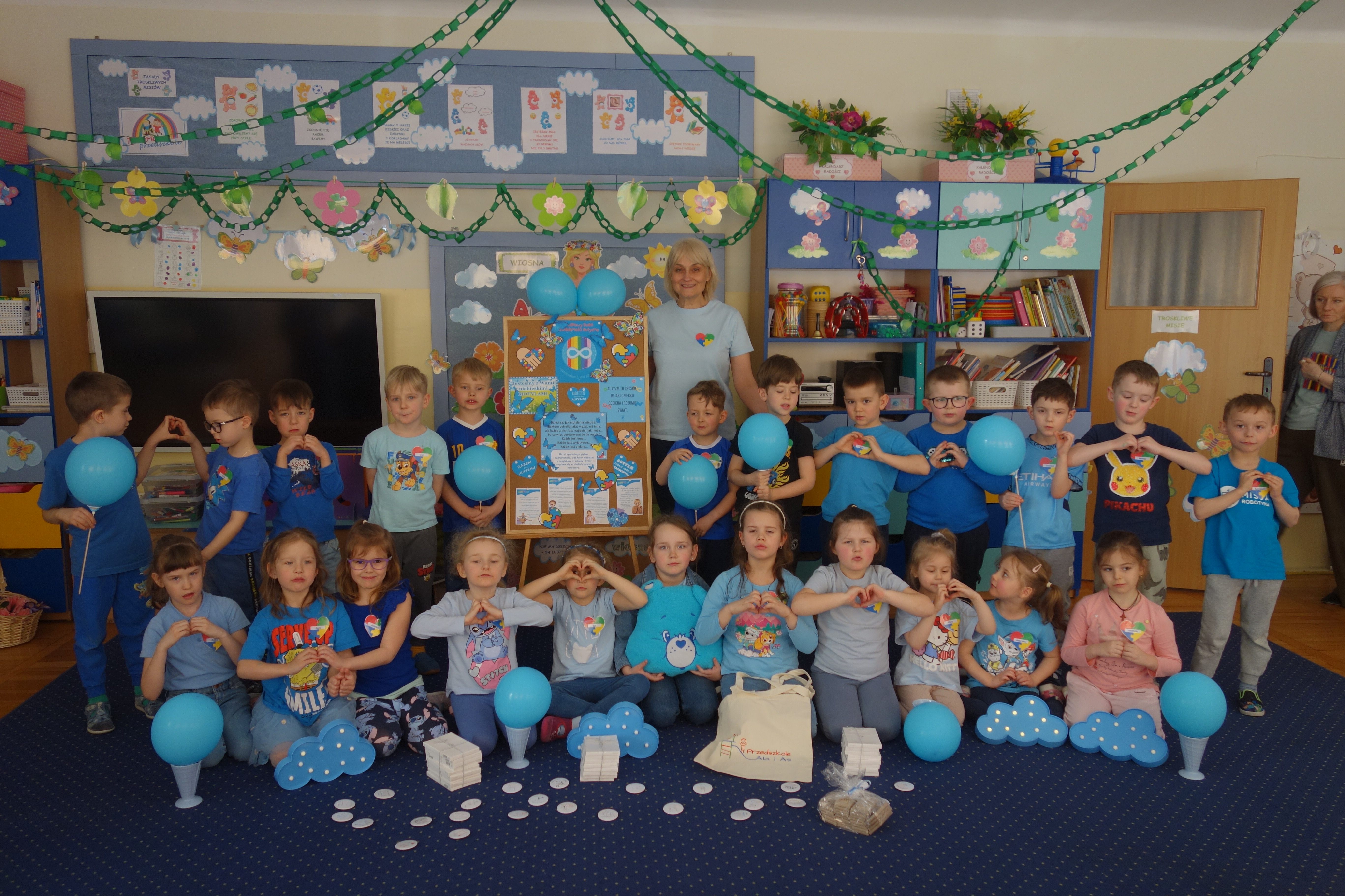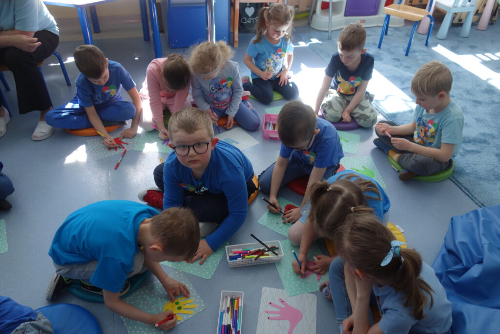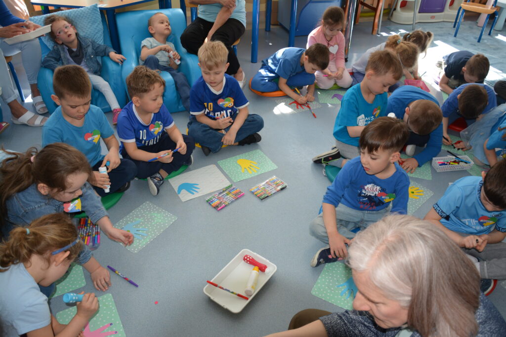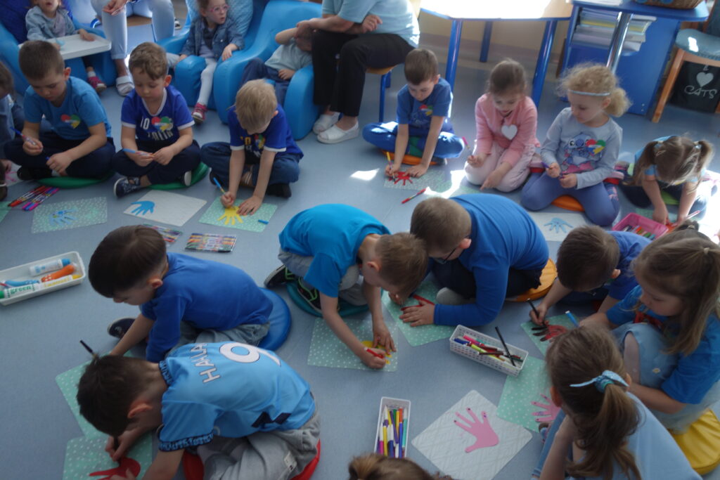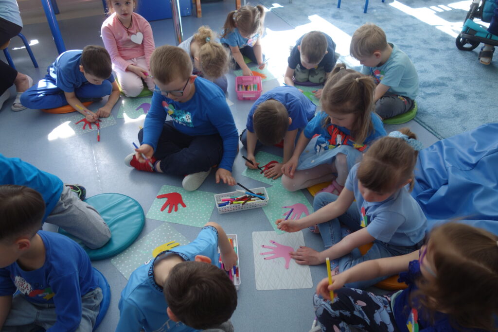 Kwiecień to miesiąc świadomości na temat autyzmu, a nasze Słoneczka po raz kolejny wzięły udział w akcji „AjakBox”. Celem tegorocznej edycji jest budowanie zrozumienia dla różnic między ludźmi oraz pokazanie dzieciom, że każdy z nas może odbierać świat w inny sposób – i że te różnice są czymś naturalnym. W tym roku Słoneczka zaprosiły do wspólnych działań i zabawy Troskliwe Misie. I tak, pewnego „niebieskiego” dnia spotkaliśmy się w sali naszych przyjaciół, a po wesołym powitaniu, wspólnie z panią Grażynką otworzyliśmy wielkie, tajemnicze pudełko. A w nim niespodzianki – duża literka A, która oczywiście oznacza autyzm i książka pt. „Za dużo! Jak uratować trudny dzień”. Dzieci uważnie słuchały historii czytanej przez panią Izę, by potem z panią Jolą móc porozmawiać o treści książki, emocjach, odczuciach jakie się z nią wiążą oraz o tym jak możemy pomóc koledze lub koleżance jeśli zobaczymy, że jest im trudno, źle, niekomfortowo. To była cenna lekcja poznania autyzmu, pomocy osobom w spektrum autyzmu oraz empatii i tolerancji. Wspólnie z paniami ze Słoneczek doszliśmy do wniosku, że każdy z nas ma super moce i dzięki tej niezwykłości i różnorodności możemy się wzajemnie wspierać i pięknie uzupełniać, a co najważniejsze uratować czyjś trudny dzień. Co też od razu chętnie przećwiczyliśmy. Ponadto Misiaki obiecały, że zawsze z takimi problemami będą się również zwracać do dorosłych, bo to przede wszystkim oni mogą szybko pomóc, wytłumaczyć i zadziałać. Kiedy już wszystko to wiedzieliśmy, nadszedł czas, aby wspólnie z panią Agnieszką, całą tą niezwykle trudną dla Misiaków wiedzę o autyzmie, poukładać i stworzyć „Plan na trudny dzień” oraz razem ze Słoneczkami zacząć tworzyć konkursowy plakat. Wszystkie dzieci ochoczo zabrały się do ozdabiania wyciętych z papieru kolorowych rączek. Misie samodzielnie, a Słoneczka z pomocą pań.