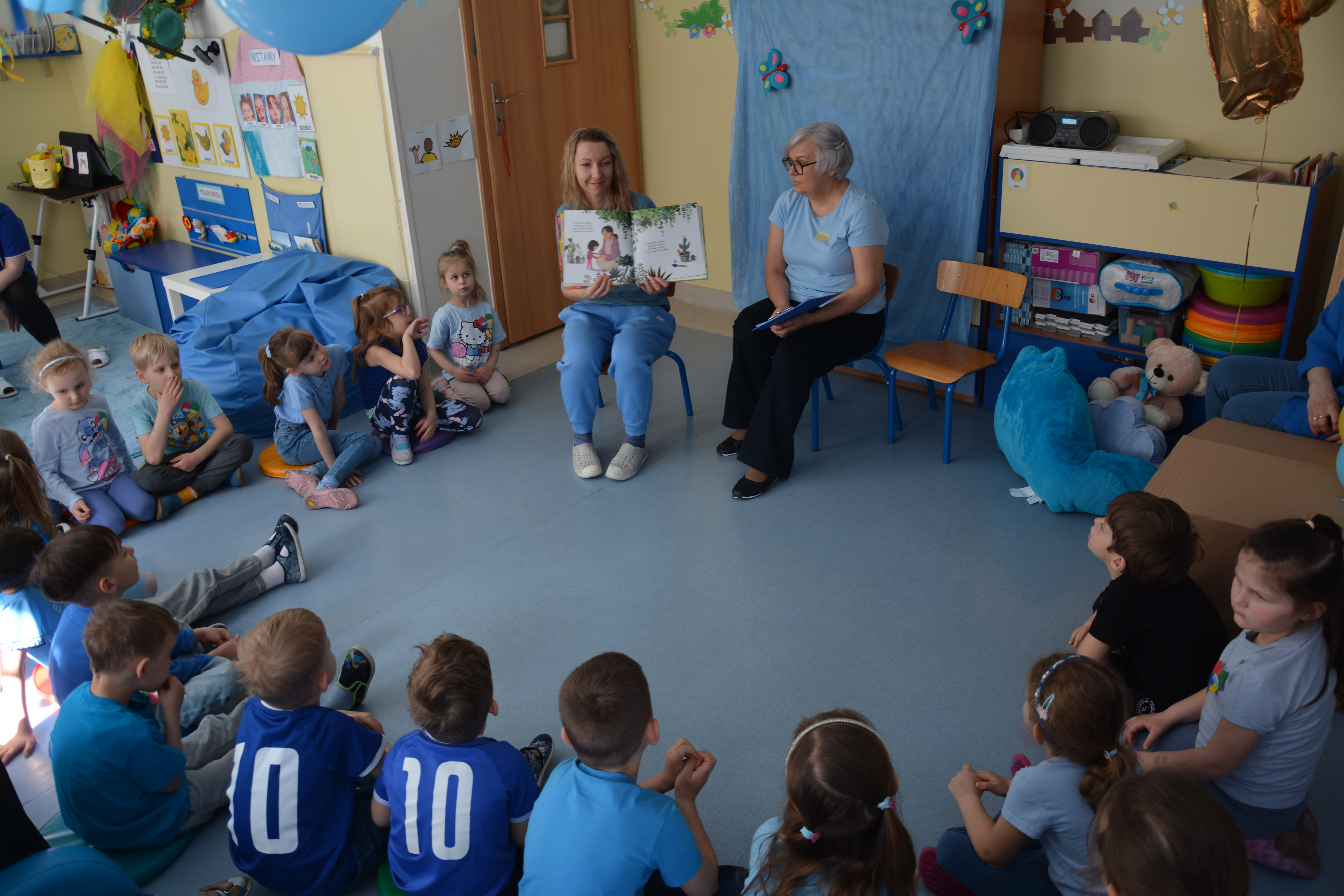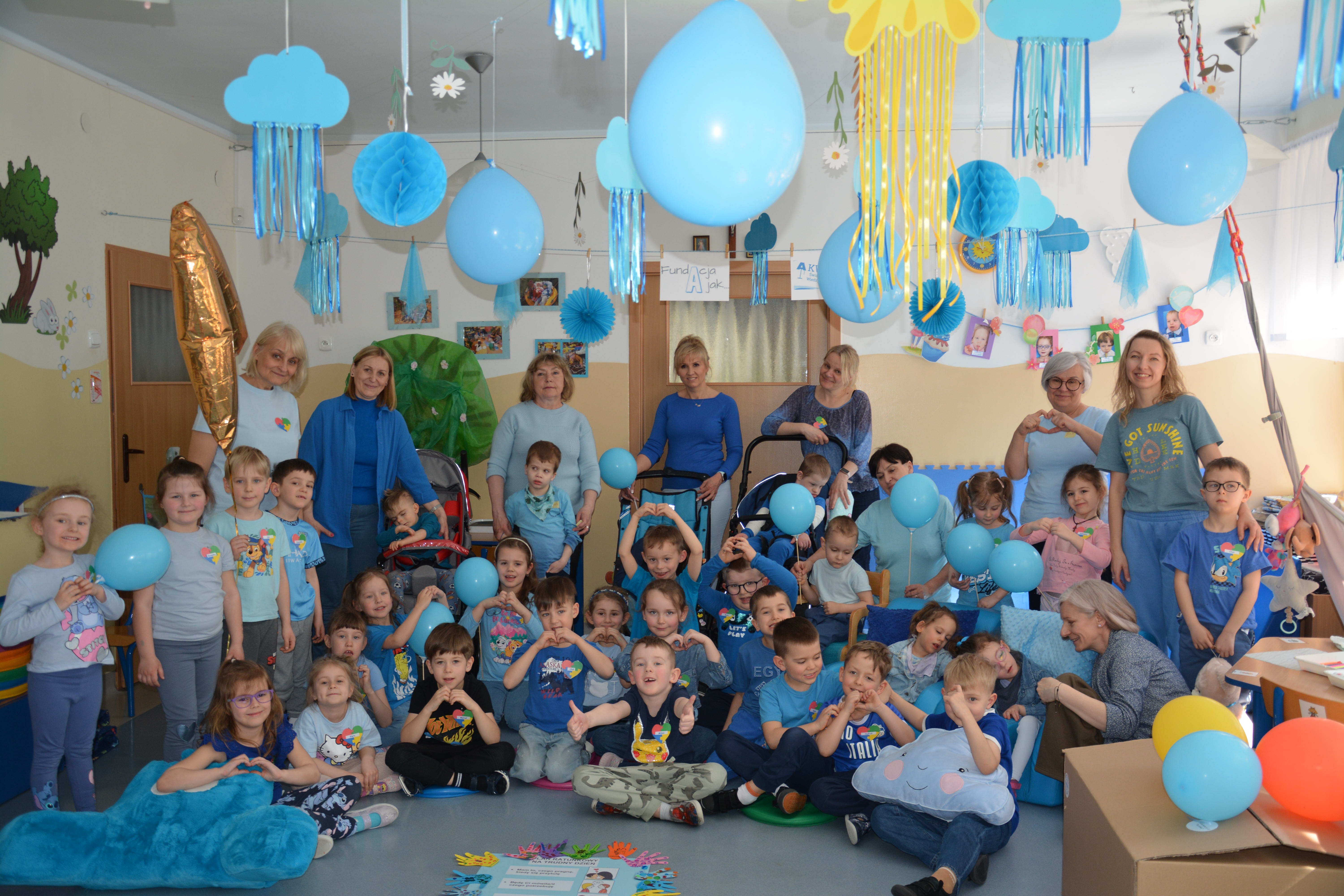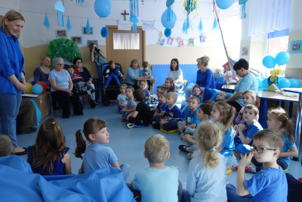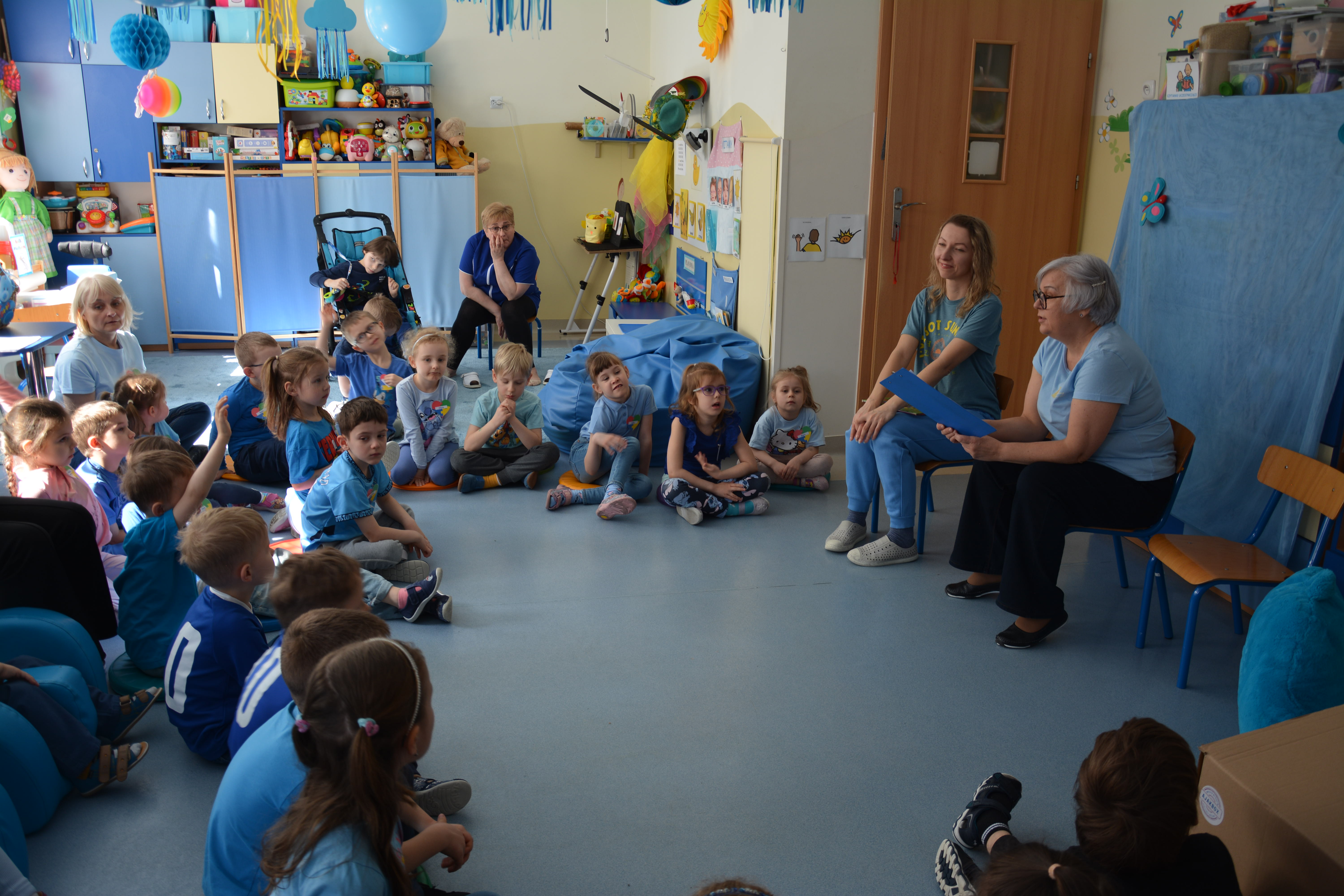 Kwiecień to miesiąc świadomości na temat autyzmu, a nasze Słoneczka po raz kolejny wzięły udział w akcji „AjakBox”. Celem tegorocznej edycji jest budowanie zrozumienia dla różnic między ludźmi oraz pokazanie dzieciom, że każdy z nas może odbierać świat w inny sposób – i że te różnice są czymś naturalnym. W tym roku Słoneczka zaprosiły do wspólnych działań i zabawy Troskliwe Misie. I tak, pewnego „niebieskiego” dnia spotkaliśmy się w sali naszych przyjaciół, a po wesołym powitaniu, wspólnie z panią Grażynką otworzyliśmy wielkie, tajemnicze pudełko. A w nim niespodzianki – duża literka A, która oczywiście oznacza autyzm i książka pt. „Za dużo! Jak uratować trudny dzień”. Dzieci uważnie słuchały historii czytanej przez panią Izę, by potem z panią Jolą móc porozmawiać o treści książki, emocjach, odczuciach jakie się z nią wiążą oraz o tym jak możemy pomóc koledze lub koleżance jeśli zobaczymy, że jest im trudno, źle, niekomfortowo. To była cenna lekcja poznania autyzmu, pomocy osobom w spektrum autyzmu oraz empatii i tolerancji. Wspólnie z paniami ze Słoneczek doszliśmy do wniosku, że każdy z nas ma super moce i dzięki tej niezwykłości i różnorodności możemy się wzajemnie wspierać i pięknie uzupełniać, a co najważniejsze uratować czyjś trudny dzień. Co też od razu chętnie przećwiczyliśmy. Ponadto Misiaki obiecały, że zawsze z takimi problemami będą się również zwracać do dorosłych, bo to przede wszystkim oni mogą szybko pomóc, wytłumaczyć i zadziałać. Kiedy już wszystko to wiedzieliśmy, nadszedł czas, aby wspólnie z panią Agnieszką, całą tą niezwykle trudną dla Misiaków wiedzę o autyzmie, poukładać i stworzyć „Plan na trudny dzień” oraz razem ze Słoneczkami zacząć tworzyć konkursowy plakat. Wszystkie dzieci ochoczo zabrały się do ozdabiania wyciętych z papieru kolorowych rączek. Misie samodzielnie, a Słoneczka z pomocą pań.