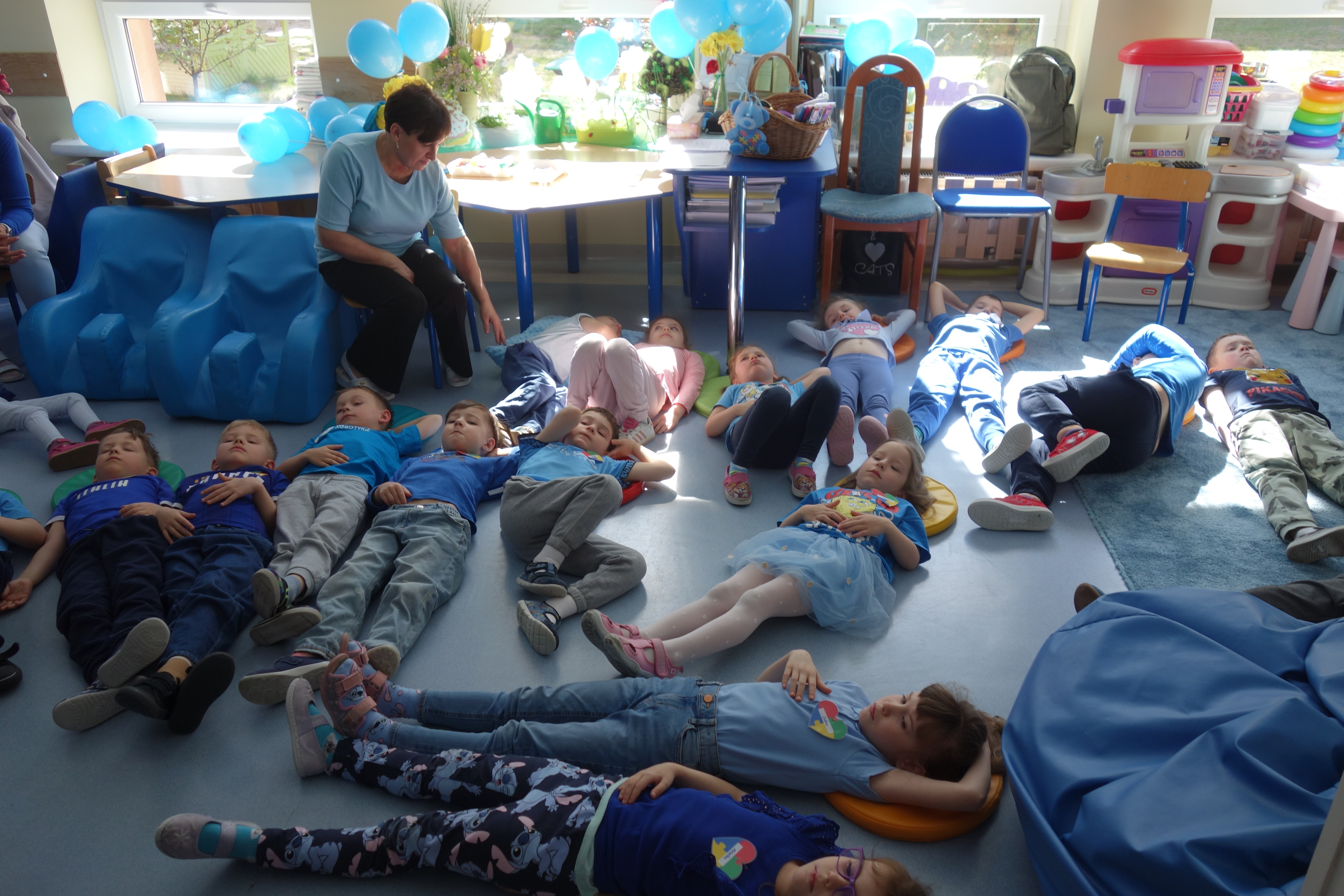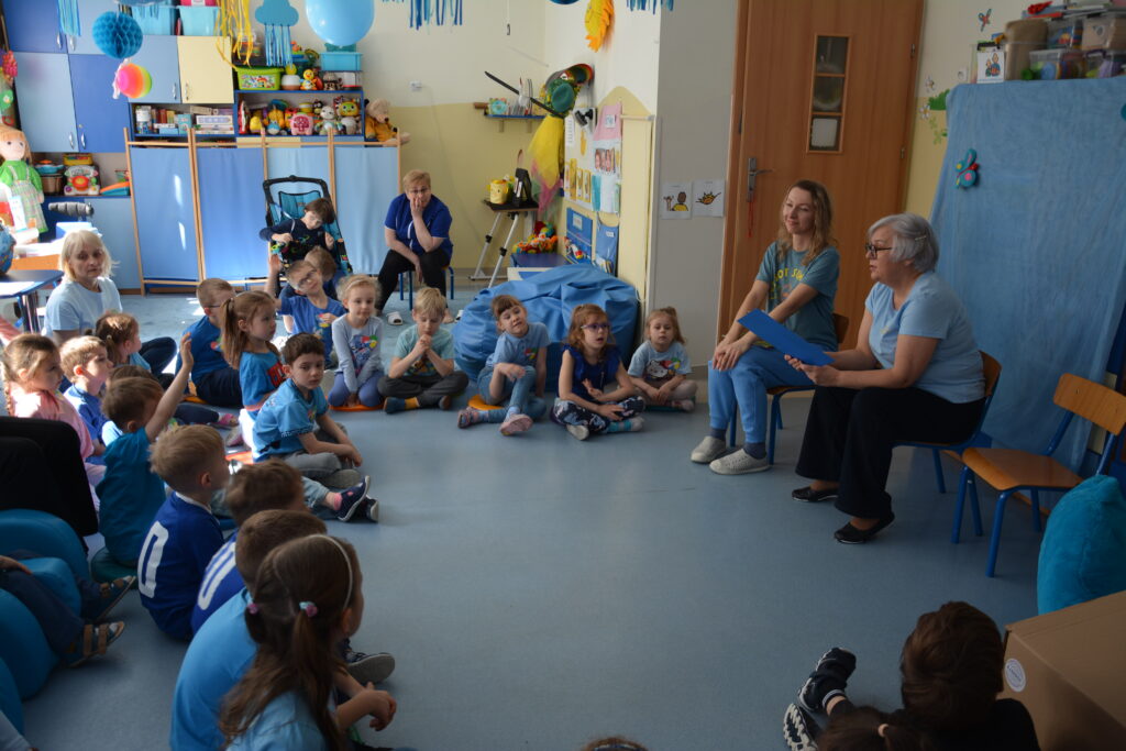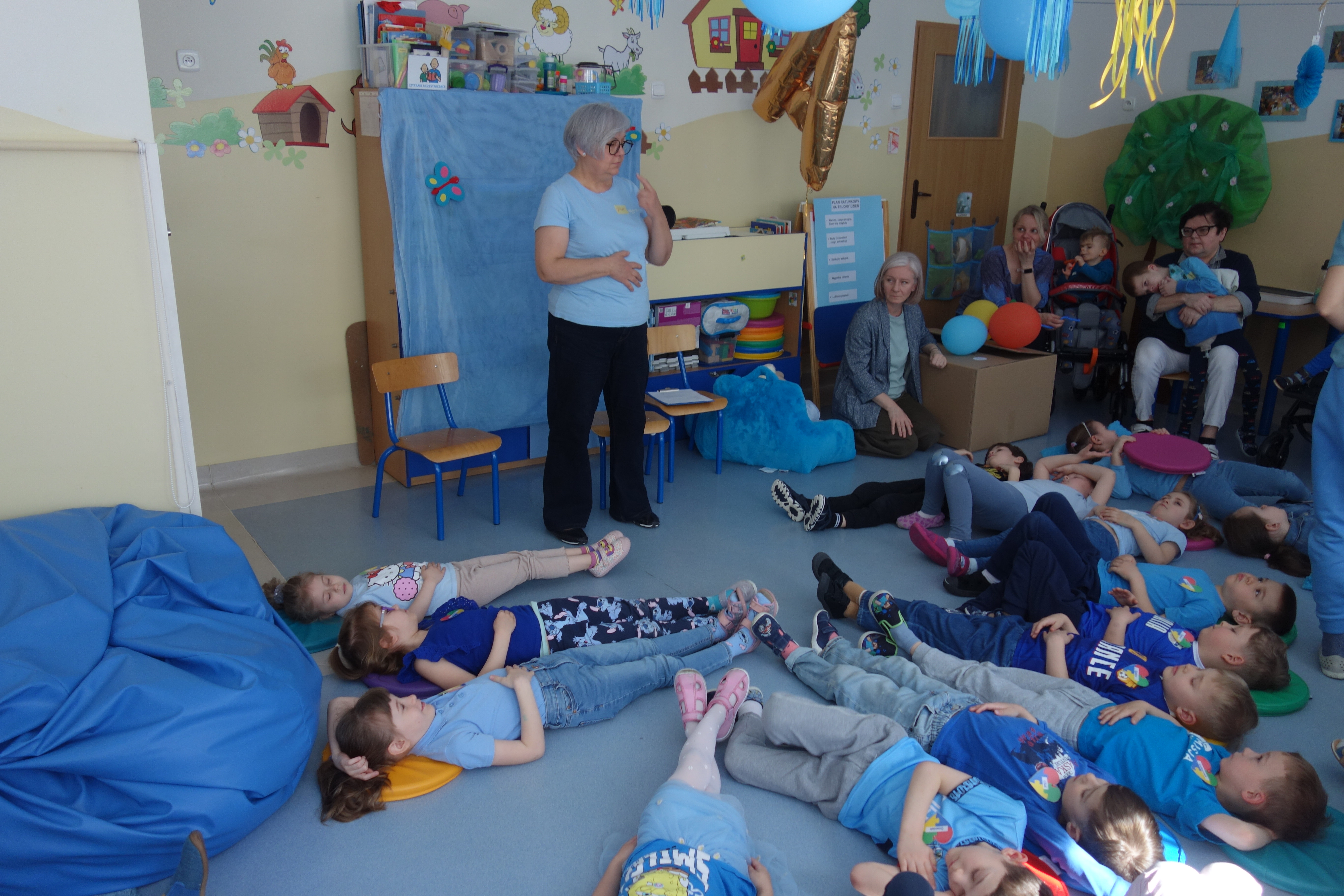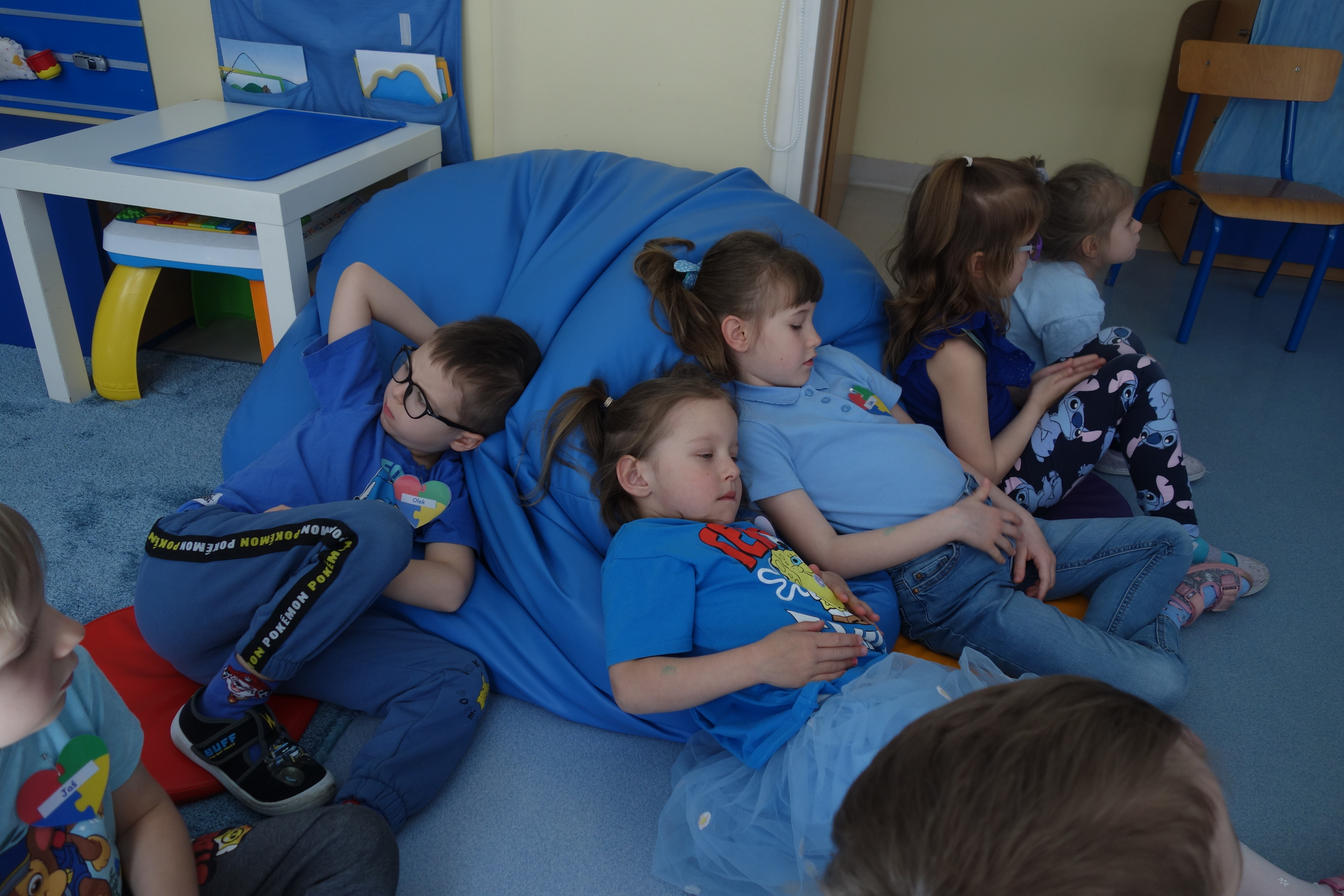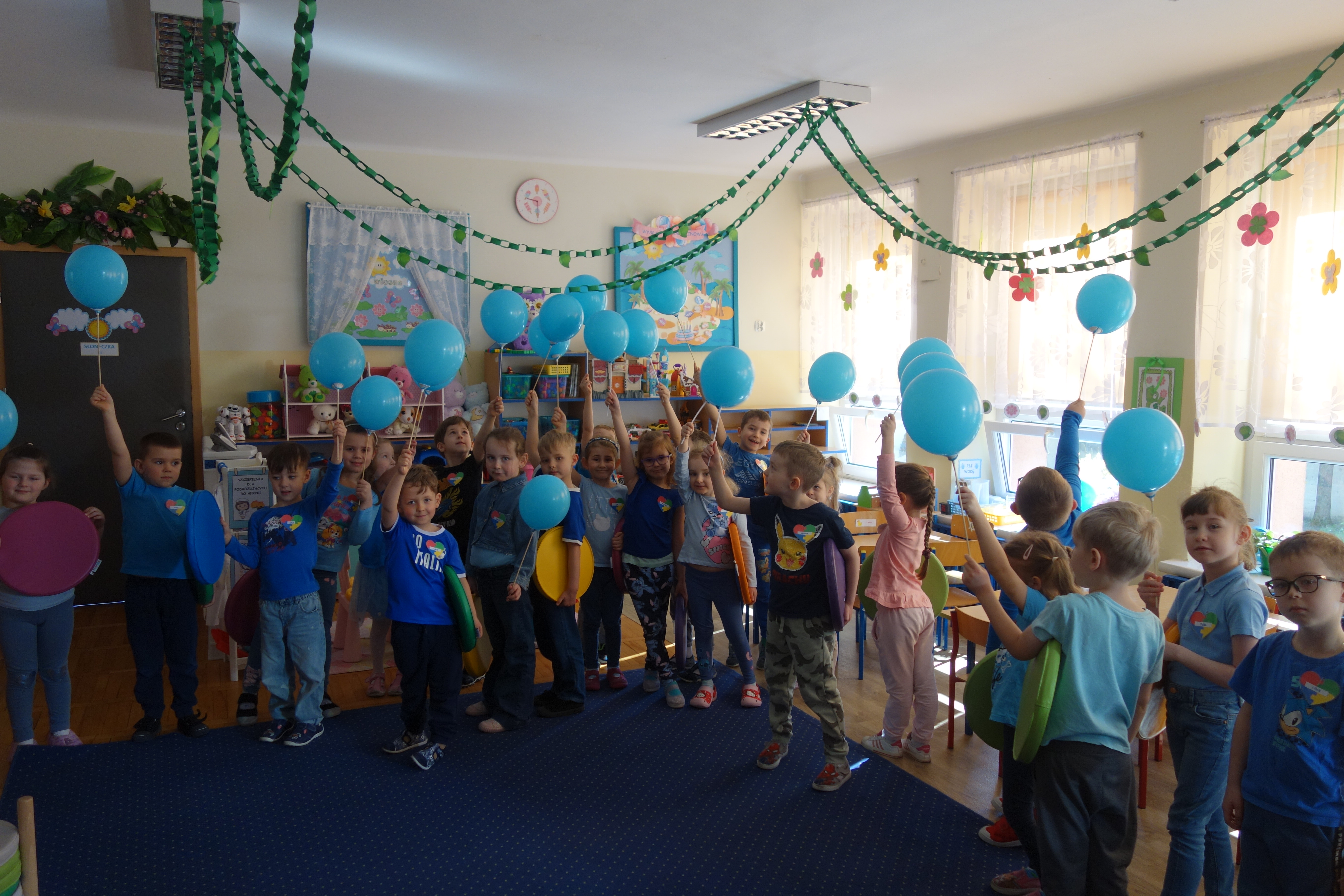 Kwiecień to miesiąc świadomości na temat autyzmu, a nasze Słoneczka po raz kolejny wzięły udział w akcji „AjakBox”. Celem tegorocznej edycji jest budowanie zrozumienia dla różnic między ludźmi oraz pokazanie dzieciom, że każdy z nas może odbierać świat w inny sposób – i że te różnice są czymś naturalnym. W tym roku Słoneczka zaprosiły do wspólnych działań i zabawy Troskliwe Misie. I tak, pewnego „niebieskiego” dnia spotkaliśmy się w sali naszych przyjaciół, a po wesołym powitaniu, wspólnie z panią Grażynką otworzyliśmy wielkie, tajemnicze pudełko. A w nim niespodzianki – duża literka A, która oczywiście oznacza autyzm i książka pt. „Za dużo! Jak uratować trudny dzień”. Dzieci uważnie słuchały historii czytanej przez panią Izę, by potem z panią Jolą móc porozmawiać o treści książki, emocjach, odczuciach jakie się z nią wiążą oraz o tym jak możemy pomóc koledze lub koleżance jeśli zobaczymy, że jest im trudno, źle, niekomfortowo. To była cenna lekcja poznania autyzmu, pomocy osobom w spektrum autyzmu oraz empatii i tolerancji. Wspólnie z paniami ze Słoneczek doszliśmy do wniosku, że każdy z nas ma super moce i dzięki tej niezwykłości i różnorodności możemy się wzajemnie wspierać i pięknie uzupełniać, a co najważniejsze uratować czyjś trudny dzień. Co też od razu chętnie przećwiczyliśmy. Ponadto Misiaki obiecały, że zawsze z takimi problemami będą się również zwracać do dorosłych, bo to przede wszystkim oni mogą szybko pomóc, wytłumaczyć i zadziałać. Kiedy już wszystko to wiedzieliśmy, nadszedł czas, aby wspólnie z panią Agnieszką, całą tą niezwykle trudną dla Misiaków wiedzę o autyzmie, poukładać i stworzyć „Plan na trudny dzień” oraz razem ze Słoneczkami zacząć tworzyć konkursowy plakat. Wszystkie dzieci ochoczo zabrały się do ozdabiania wyciętych z papieru kolorowych rączek. Misie samodzielnie, a Słoneczka z pomocą pań.