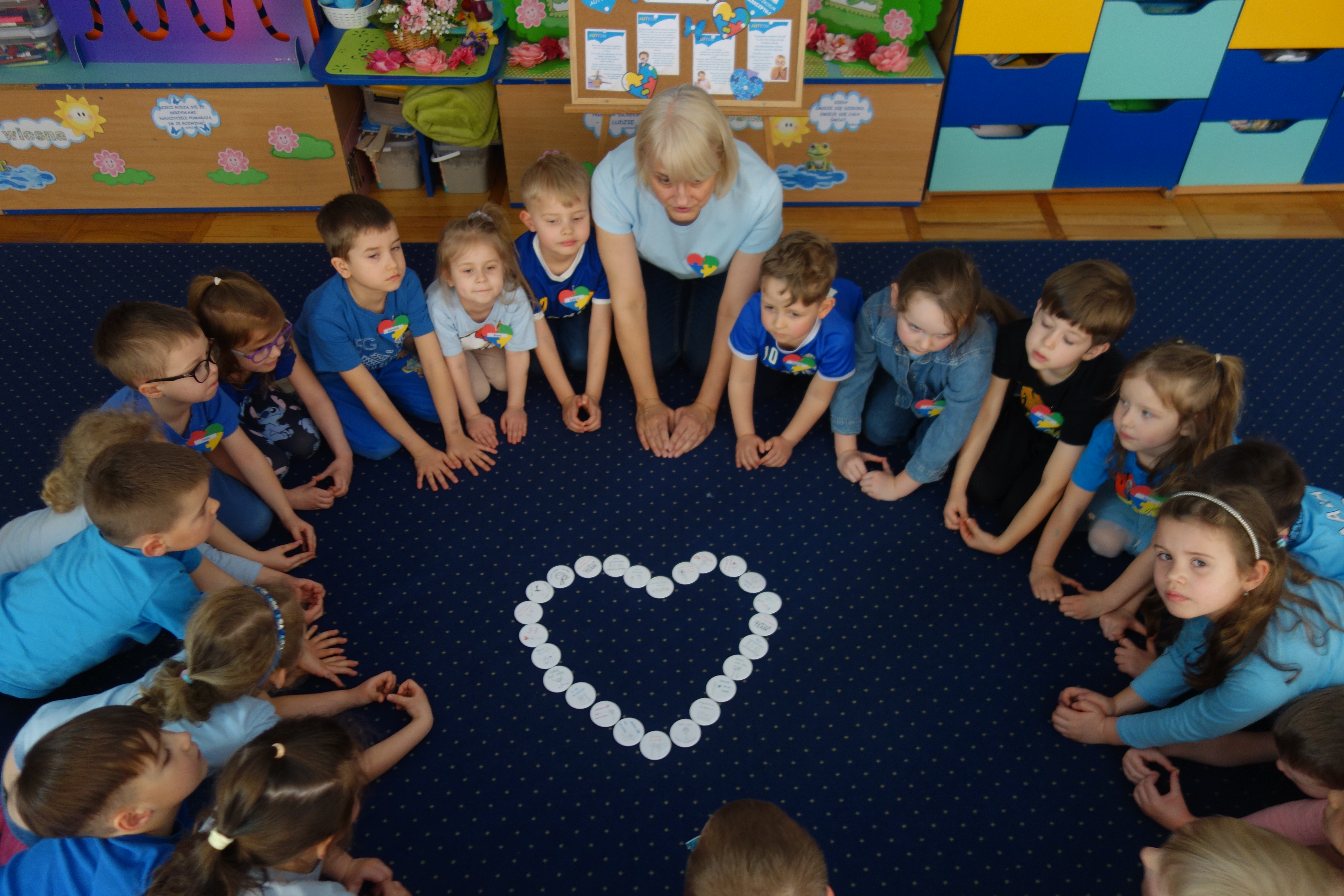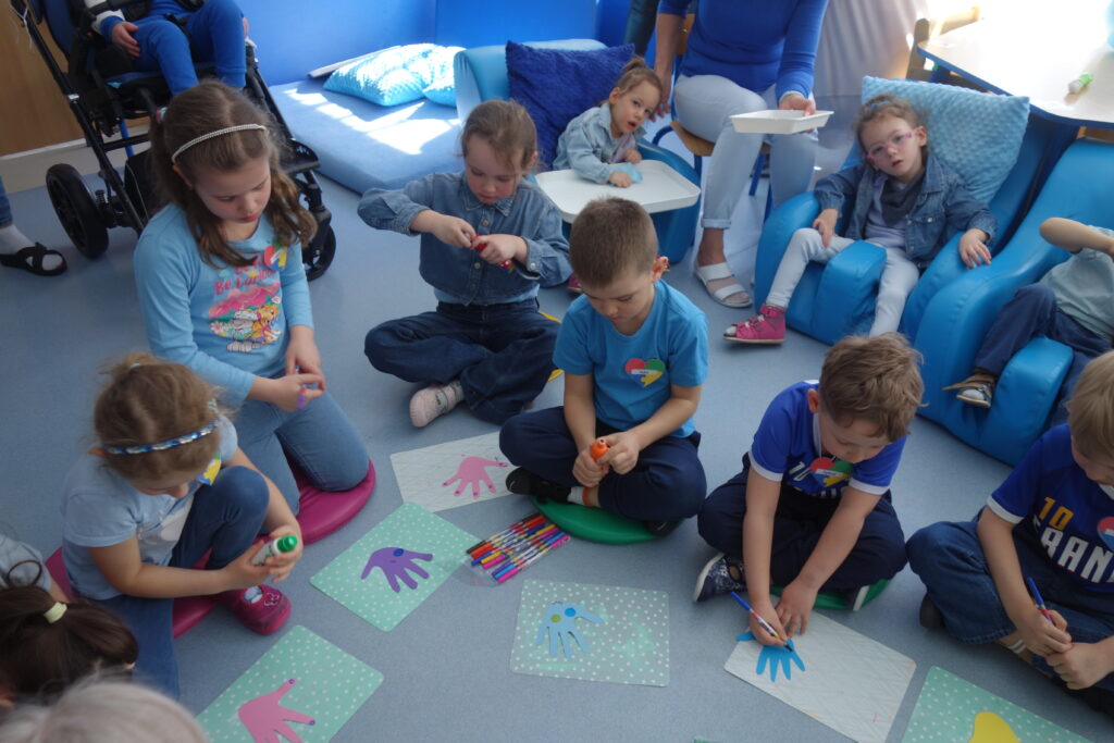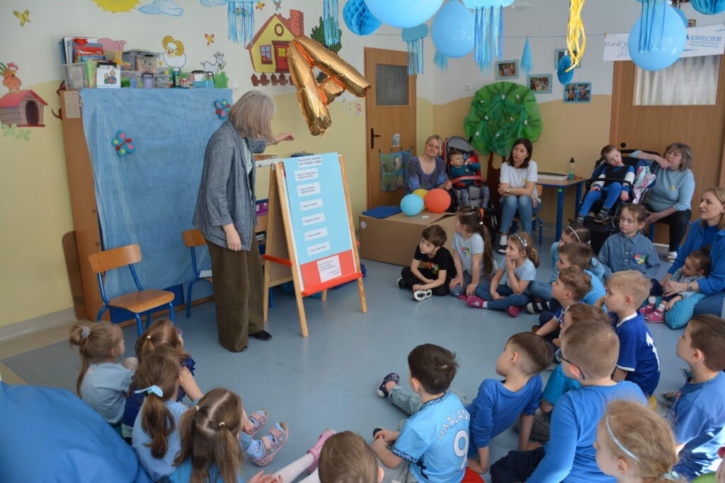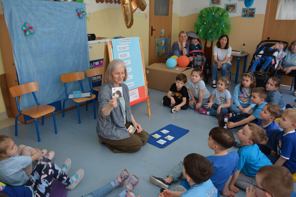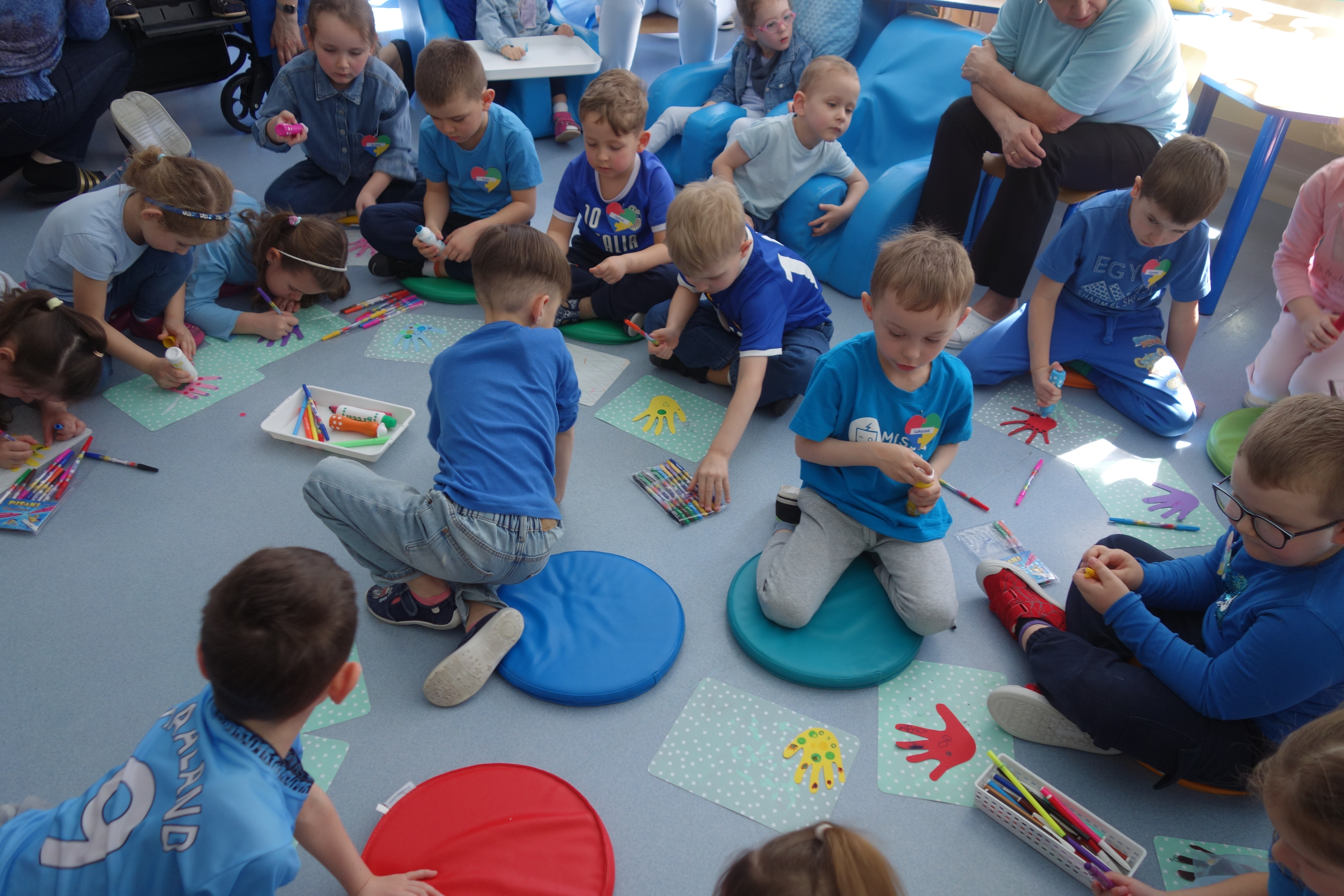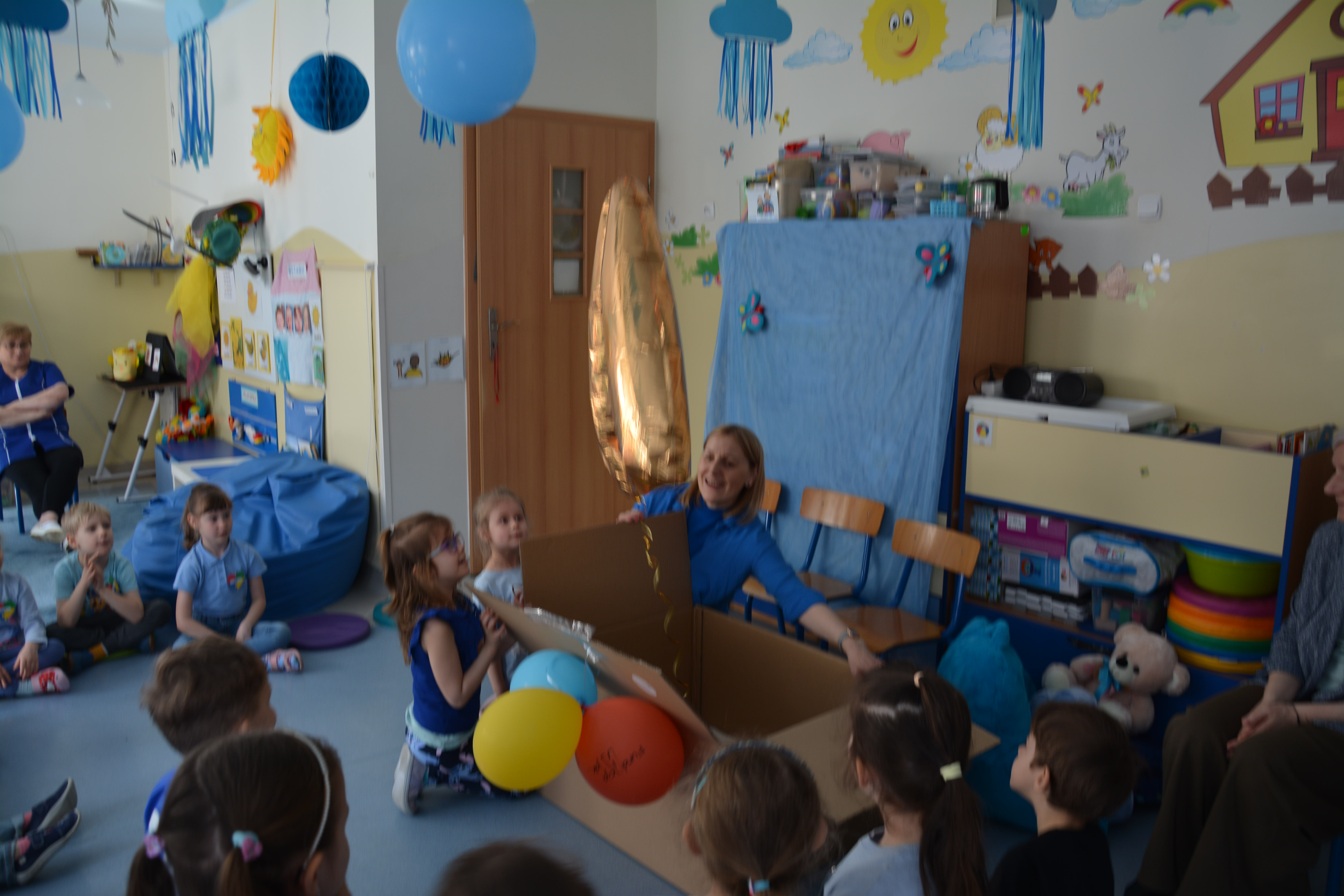 Kwiecień to miesiąc świadomości na temat autyzmu, a nasze Słoneczka po raz kolejny wzięły udział w akcji „AjakBox”. Celem tegorocznej edycji jest budowanie zrozumienia dla różnic między ludźmi oraz pokazanie dzieciom, że każdy z nas może odbierać świat w inny sposób – i że te różnice są czymś naturalnym. W tym roku Słoneczka zaprosiły do wspólnych działań i zabawy Troskliwe Misie. I tak, pewnego „niebieskiego” dnia spotkaliśmy się w sali naszych przyjaciół, a po wesołym powitaniu, wspólnie z panią Grażynką otworzyliśmy wielkie, tajemnicze pudełko. A w nim niespodzianki – duża literka A, która oczywiście oznacza autyzm i książka pt. „Za dużo! Jak uratować trudny dzień”. Dzieci uważnie słuchały historii czytanej przez panią Izę, by potem z panią Jolą móc porozmawiać o treści książki, emocjach, odczuciach jakie się z nią wiążą oraz o tym jak możemy pomóc koledze lub koleżance jeśli zobaczymy, że jest im trudno, źle, niekomfortowo. To była cenna lekcja poznania autyzmu, pomocy osobom w spektrum autyzmu oraz empatii i tolerancji. Wspólnie z paniami ze Słoneczek doszliśmy do wniosku, że każdy z nas ma super moce i dzięki tej niezwykłości i różnorodności możemy się wzajemnie wspierać i pięknie uzupełniać, a co najważniejsze uratować czyjś trudny dzień. Co też od razu chętnie przećwiczyliśmy. Ponadto Misiaki obiecały, że zawsze z takimi problemami będą się również zwracać do dorosłych, bo to przede wszystkim oni mogą szybko pomóc, wytłumaczyć i zadziałać. Kiedy już wszystko to wiedzieliśmy, nadszedł czas, aby wspólnie z panią Agnieszką, całą tą niezwykle trudną dla Misiaków wiedzę o autyzmie, poukładać i stworzyć „Plan na trudny dzień” oraz razem ze Słoneczkami zacząć tworzyć konkursowy plakat. Wszystkie dzieci ochoczo zabrały się do ozdabiania wyciętych z papieru kolorowych rączek. Misie samodzielnie, a Słoneczka z pomocą pań.