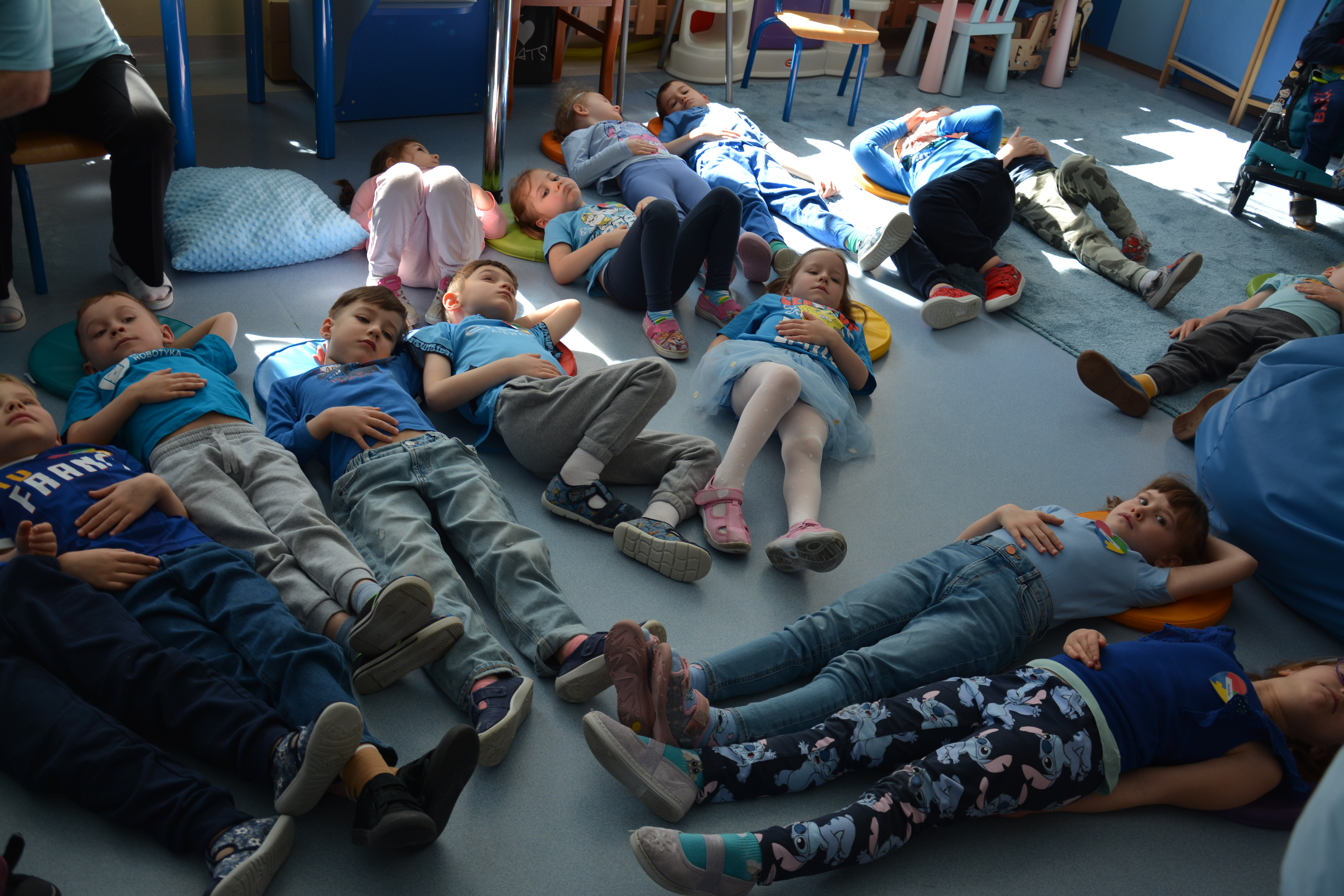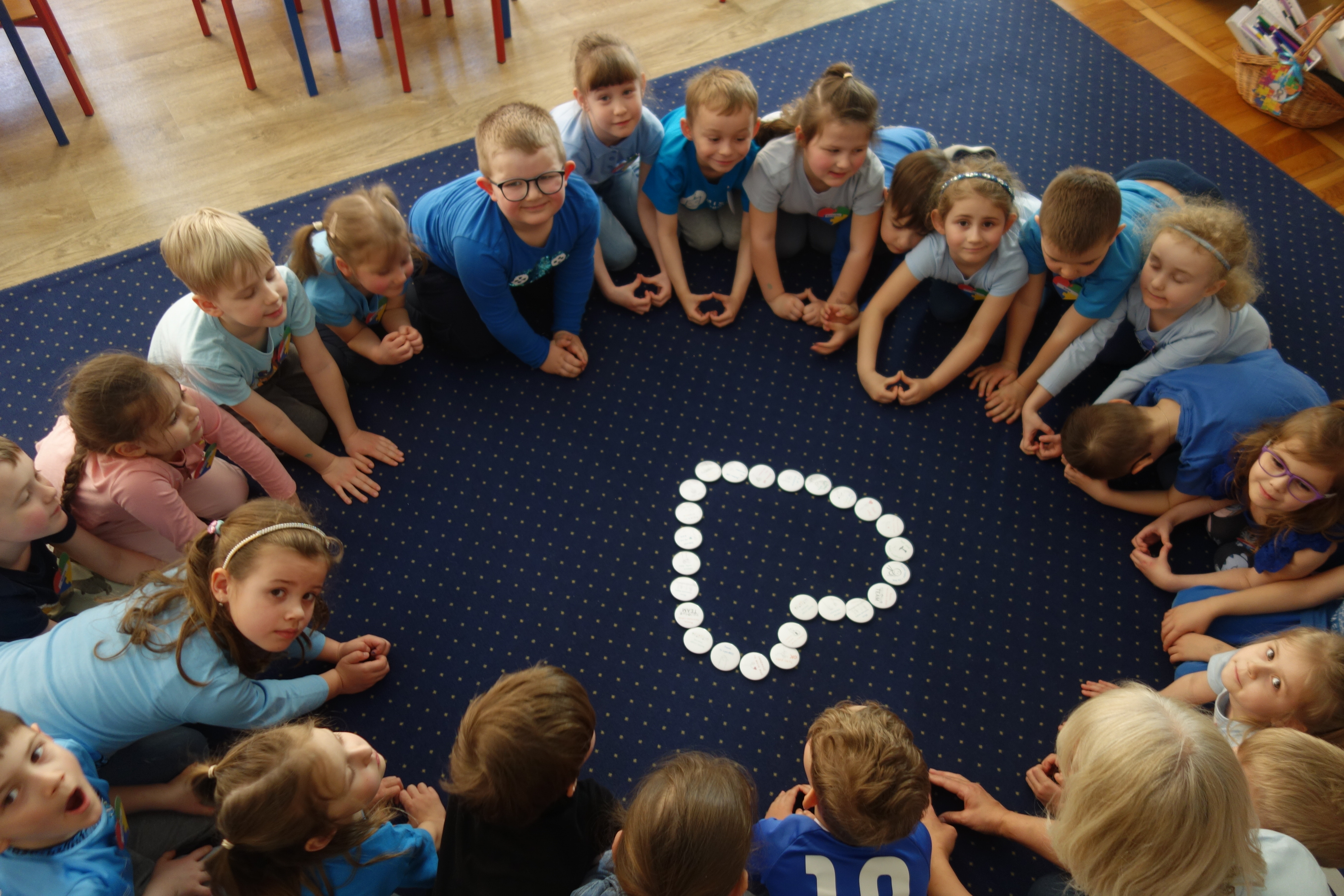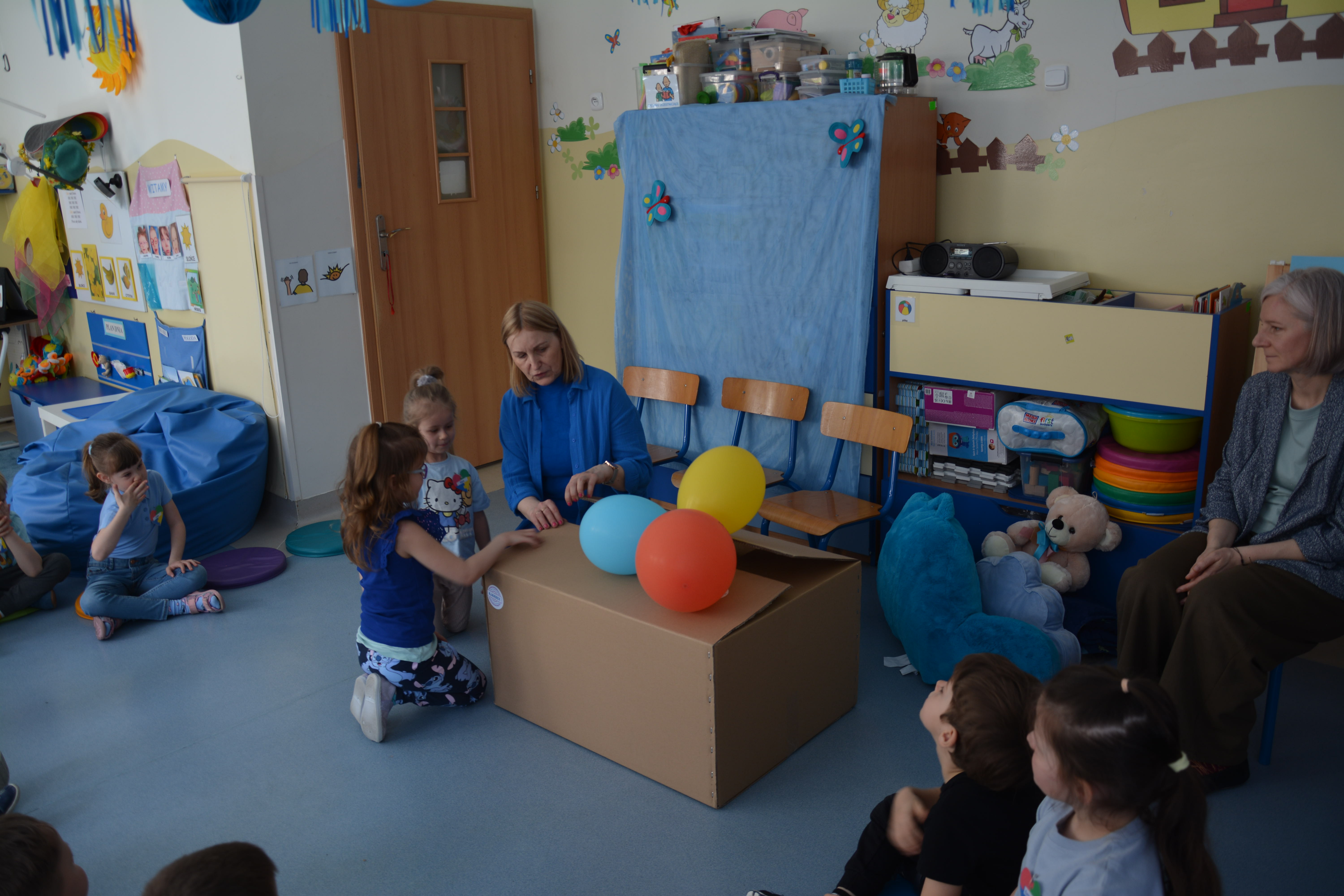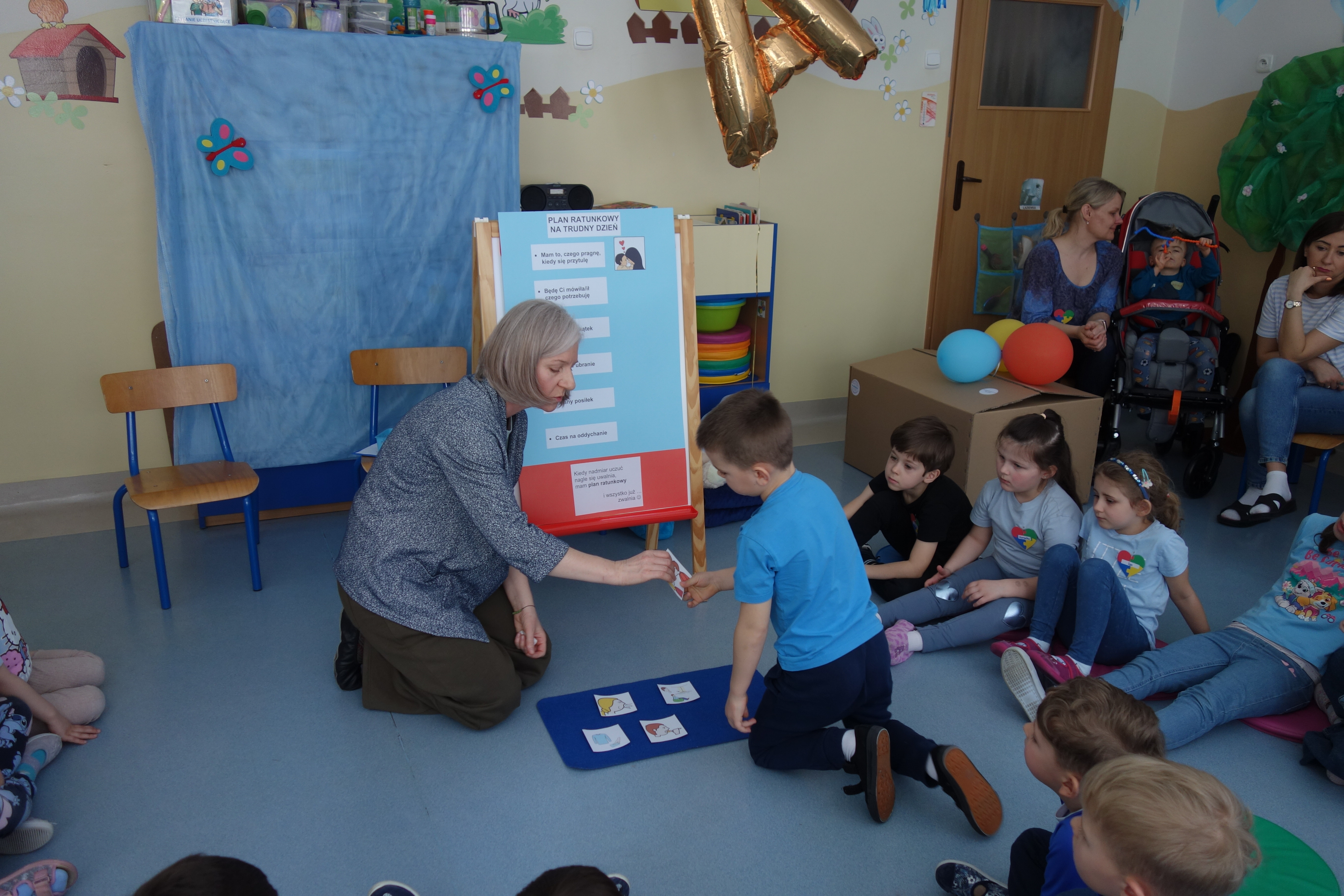 Kwiecień to miesiąc świadomości na temat autyzmu, a nasze Słoneczka po raz kolejny wzięły udział w akcji „AjakBox”. Celem tegorocznej edycji jest budowanie zrozumienia dla różnic między ludźmi oraz pokazanie dzieciom, że każdy z nas może odbierać świat w inny sposób – i że te różnice są czymś naturalnym. W tym roku Słoneczka zaprosiły do wspólnych działań i zabawy Troskliwe Misie. I tak, pewnego „niebieskiego” dnia spotkaliśmy się w sali naszych przyjaciół, a po wesołym powitaniu, wspólnie z panią Grażynką otworzyliśmy wielkie, tajemnicze pudełko. A w nim niespodzianki – duża literka A, która oczywiście oznacza autyzm i książka pt. „Za dużo! Jak uratować trudny dzień”. Dzieci uważnie słuchały historii czytanej przez panią Izę, by potem z panią Jolą móc porozmawiać o treści książki, emocjach, odczuciach jakie się z nią wiążą oraz o tym jak możemy pomóc koledze lub koleżance jeśli zobaczymy, że jest im trudno, źle, niekomfortowo. To była cenna lekcja poznania autyzmu, pomocy osobom w spektrum autyzmu oraz empatii i tolerancji. Wspólnie z paniami ze Słoneczek doszliśmy do wniosku, że każdy z nas ma super moce i dzięki tej niezwykłości i różnorodności możemy się wzajemnie wspierać i pięknie uzupełniać, a co najważniejsze uratować czyjś trudny dzień. Co też od razu chętnie przećwiczyliśmy. Ponadto Misiaki obiecały, że zawsze z takimi problemami będą się również zwracać do dorosłych, bo to przede wszystkim oni mogą szybko pomóc, wytłumaczyć i zadziałać. Kiedy już wszystko to wiedzieliśmy, nadszedł czas, aby wspólnie z panią Agnieszką, całą tą niezwykle trudną dla Misiaków wiedzę o autyzmie, poukładać i stworzyć „Plan na trudny dzień” oraz razem ze Słoneczkami zacząć tworzyć konkursowy plakat. Wszystkie dzieci ochoczo zabrały się do ozdabiania wyciętych z papieru kolorowych rączek. Misie samodzielnie, a Słoneczka z pomocą pań.