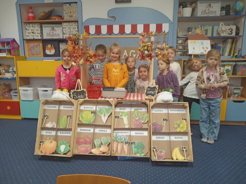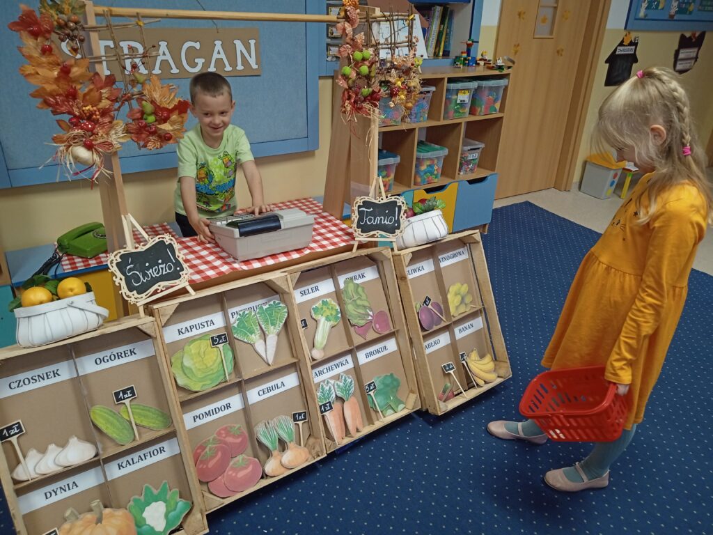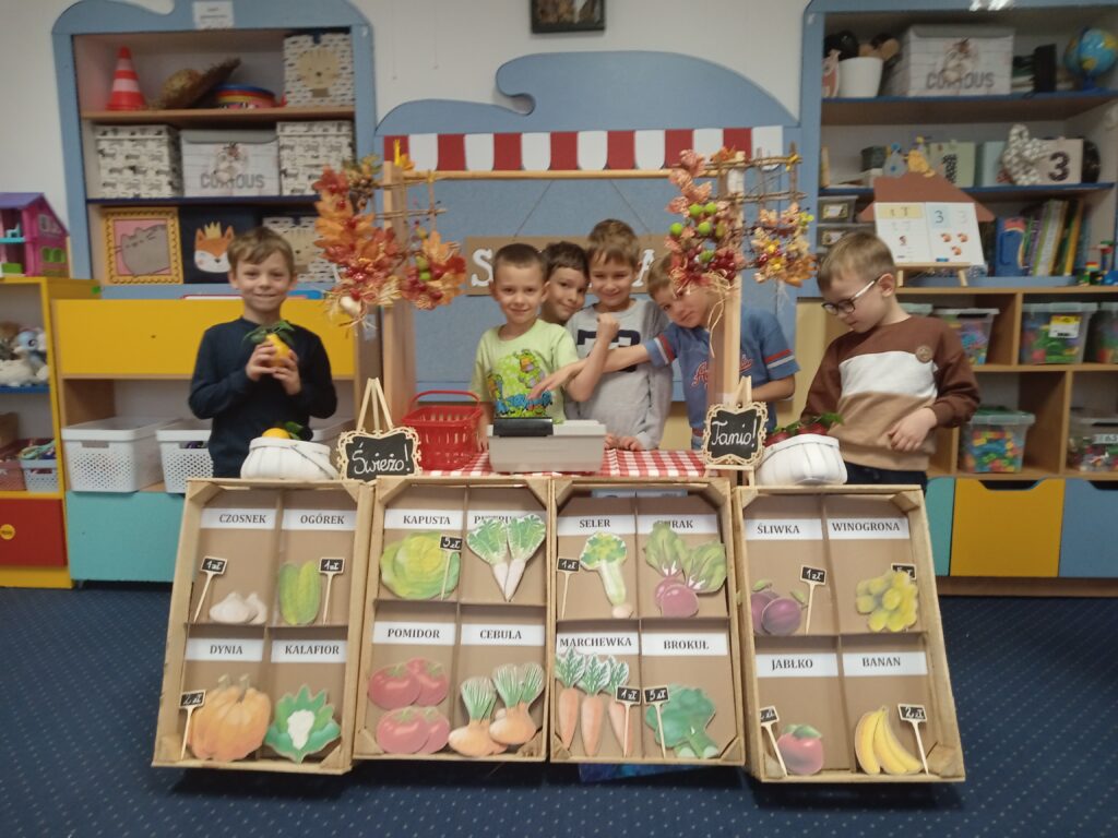 W naszej grupie odbyła się zabawa tematyczna pt. „Stragan”, podczas której dzieci mogły wcielić się w role sprzedawców i kupujących. Sala zamieniła się w kolorowy targ pełen warzyw, owoców, kwiatów i innych produktów.