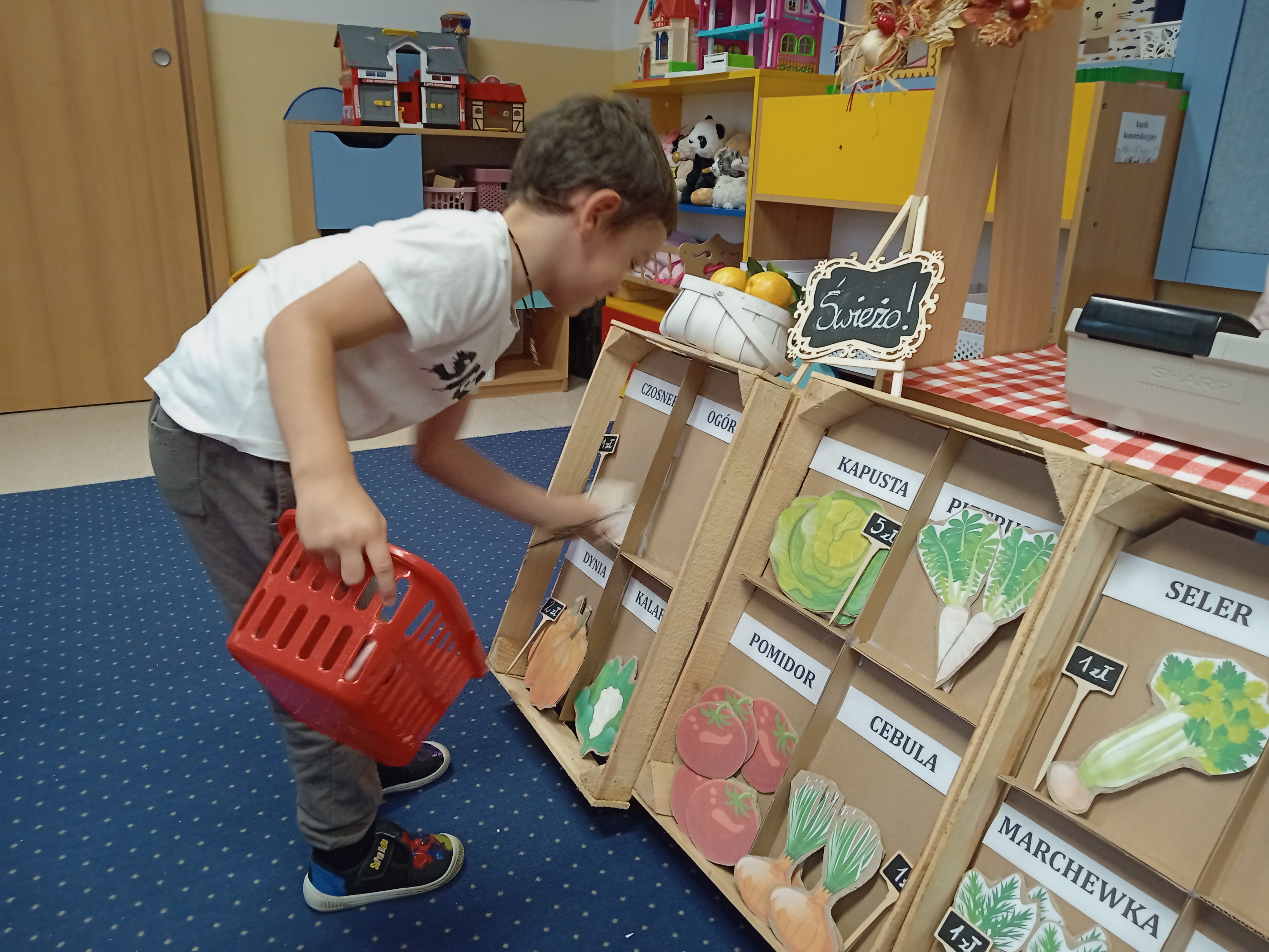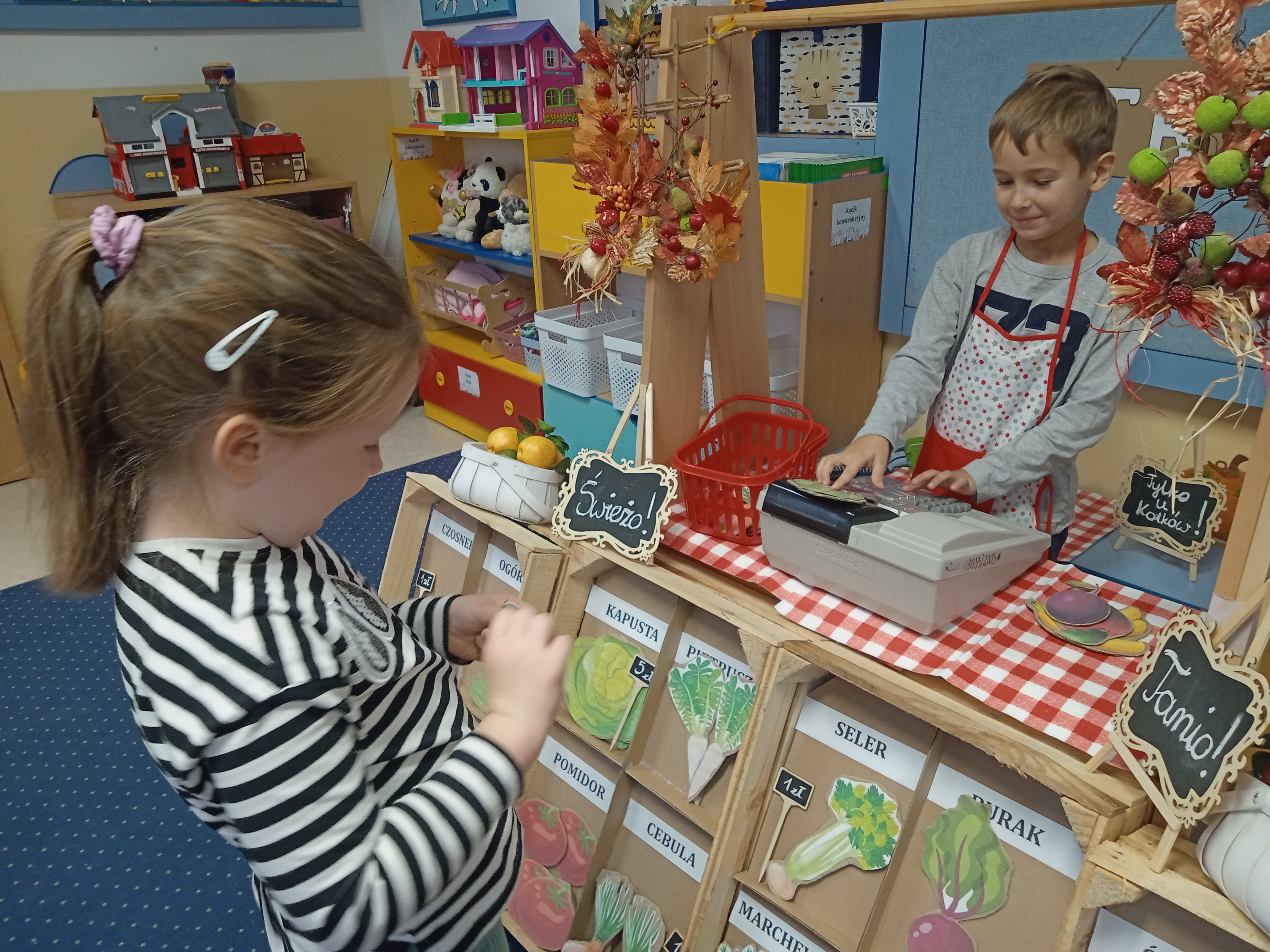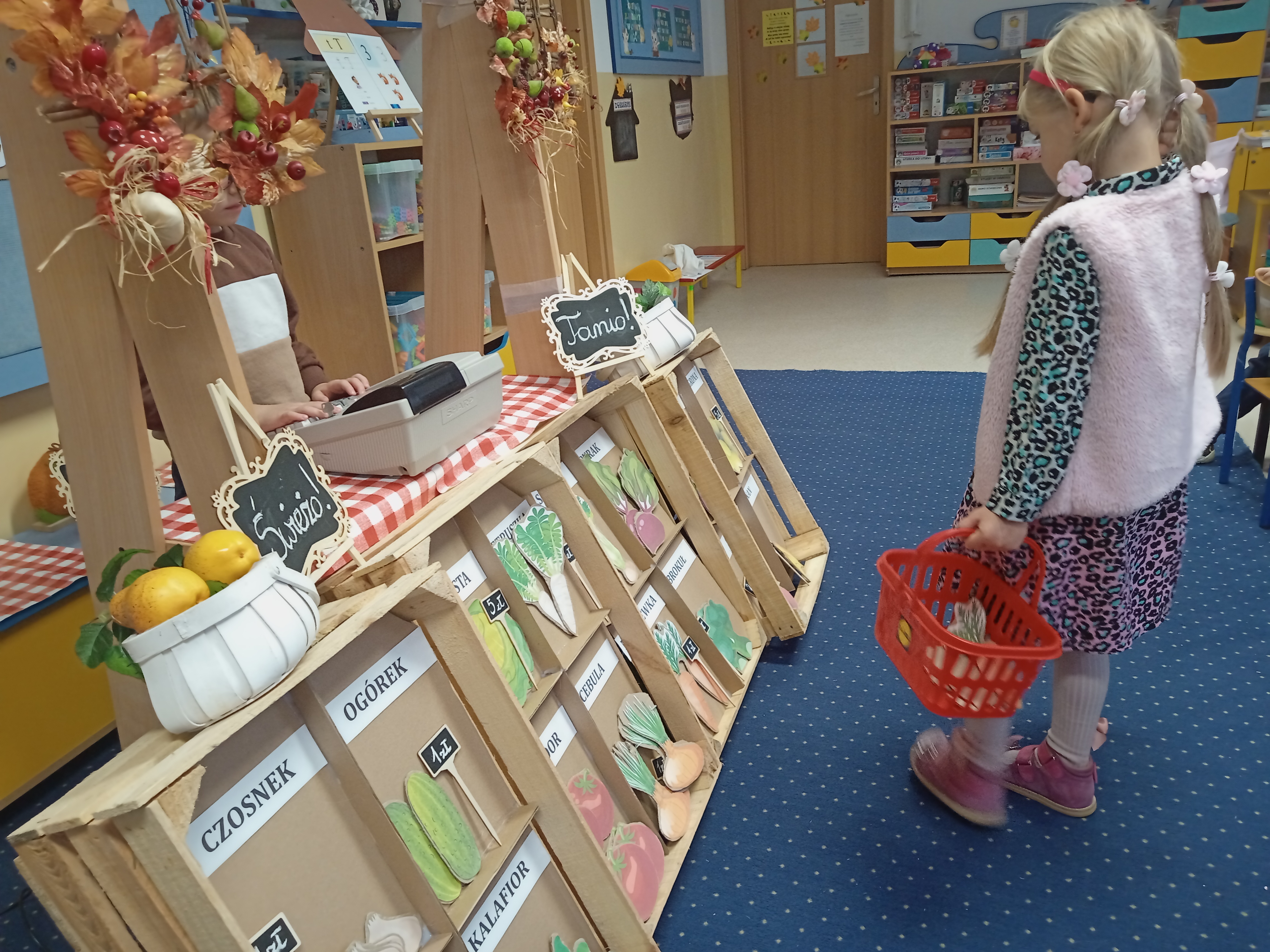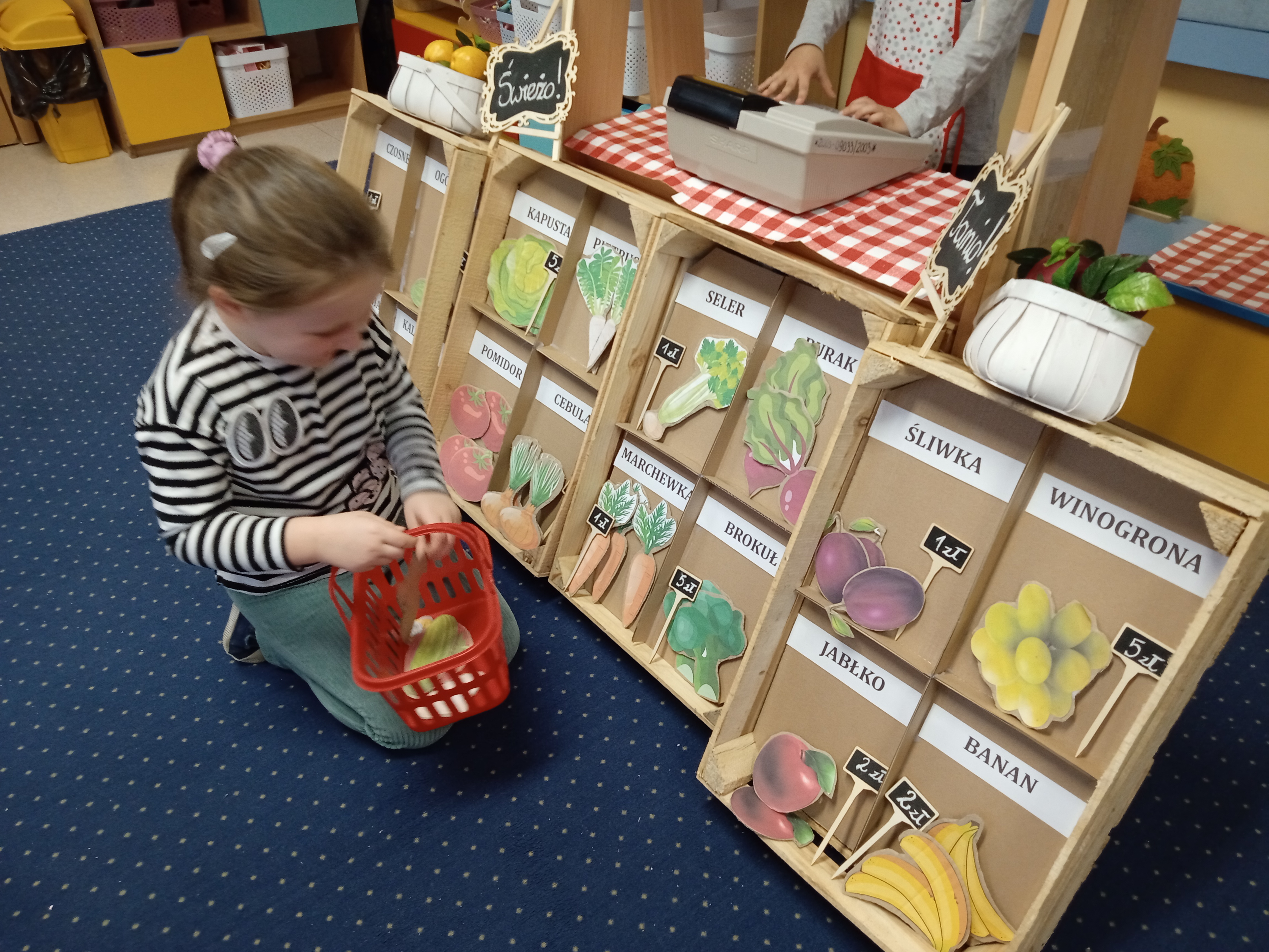 W naszej grupie odbyła się zabawa tematyczna pt. „Stragan”, podczas której dzieci mogły wcielić się w role sprzedawców i kupujących. Sala zamieniła się w kolorowy targ pełen warzyw, owoców, kwiatów i innych produktów.