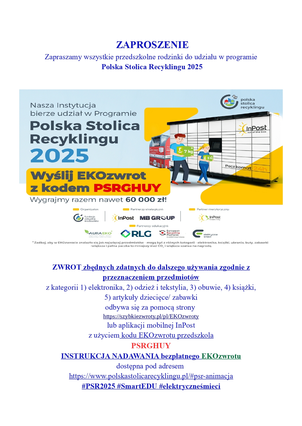 Nasze przedszkole bierze udział w ogólnopolskim programie „Polska Stolica Recyklingu”, który trwa do 31 grudnia 2025 roku.